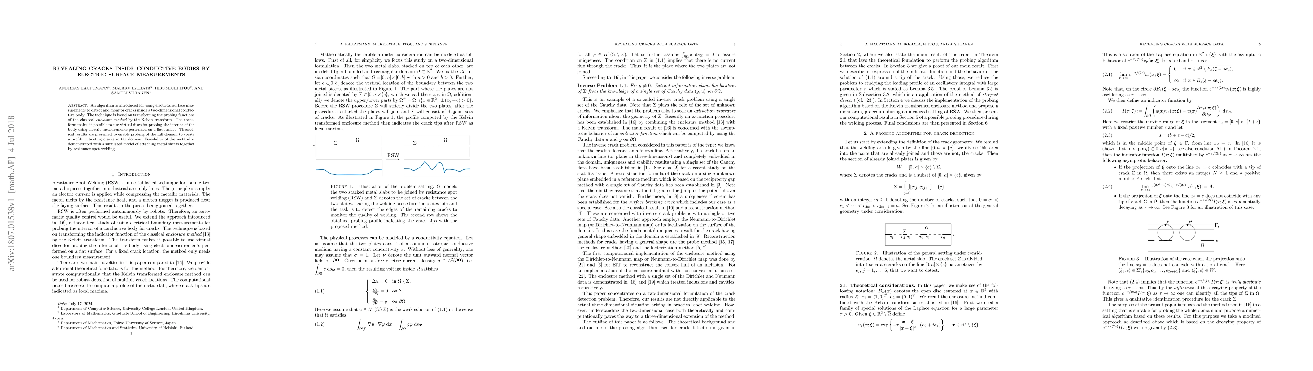 An algorithm is introduced for using electrical surface measurements to detect and monitor cracks inside a two-dimensional conductive body. The technique is based on transforming the probing functions of the classical enclosure method by the Kelvin transform. The transform makes it possible to use virtual discs for probing the interior of the body using electric measurements performed on a flat surface. Theoretical results are presented to enable probing of the full domain to create a profile indicating cracks in the domain. Feasibility of the method is demonstrated with a simulated model of attaching metal sheets together by resistance spot welding.