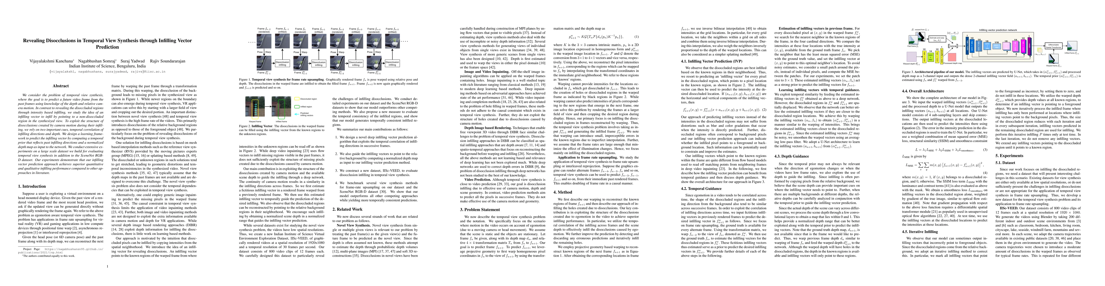 This paper proposes a method for temporal view synthesis using infilling vector prediction to reveal disoccluded regions by pointing to non-disoccluded areas, leveraging temporal correlation and depth cues. The approach outperforms existing methods based on extensive experiments on custom and existing datasets.