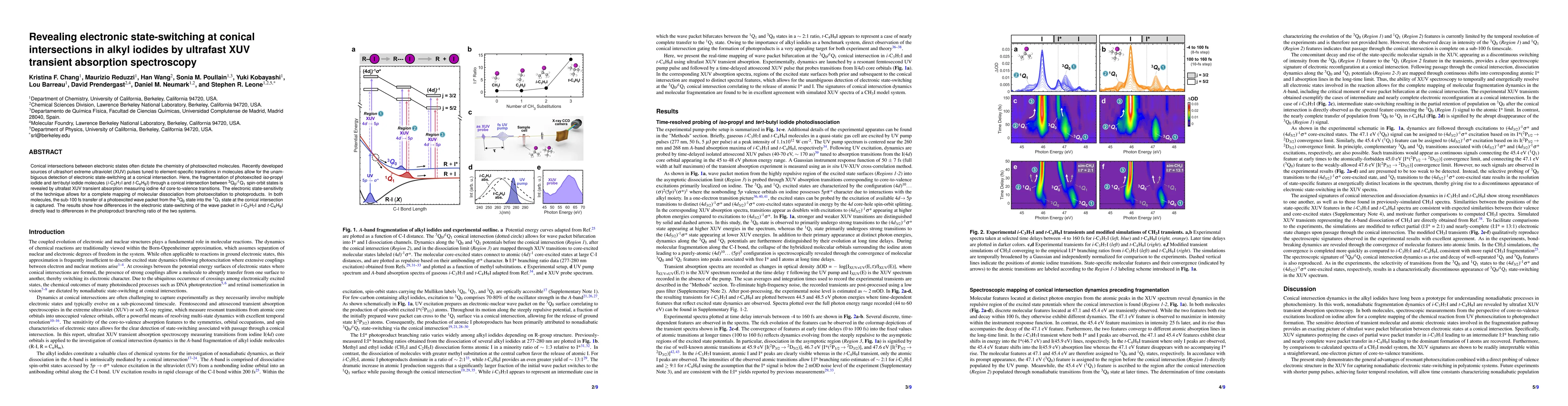 This study uses ultrafast XUV transient absorption spectroscopy to reveal electronic state-switching at conical intersections in iso-propyl and tert-butyl iodides, mapping the dissociation process from photoexcitation to photoproducts and showing how different electronic state-switching leads to varying photoproduct branching ratios.