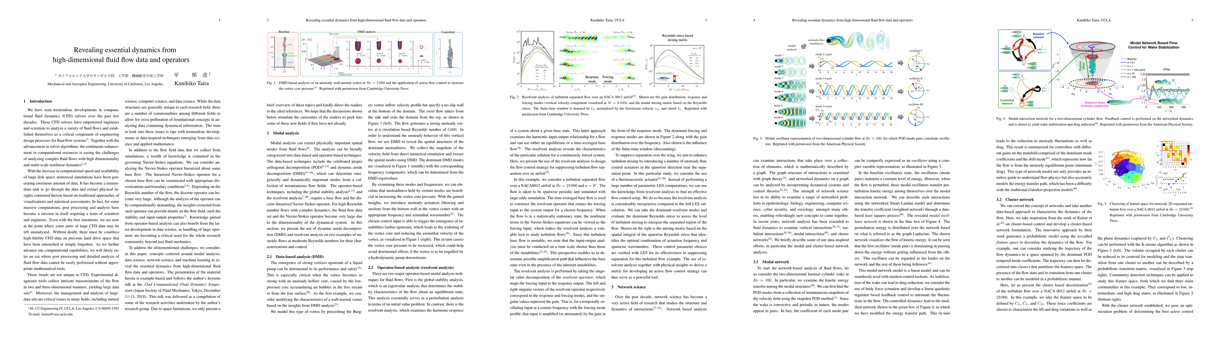 This paper utilizes modal analysis, data science, network science, and machine learning to extract essential dynamics from high-dimensional fluid flow data and operators, showcasing the author's research group's activities through example-based presentations. The material was originally presented at the 32nd Computational Fluid Dynamics Symposium in Tokyo.