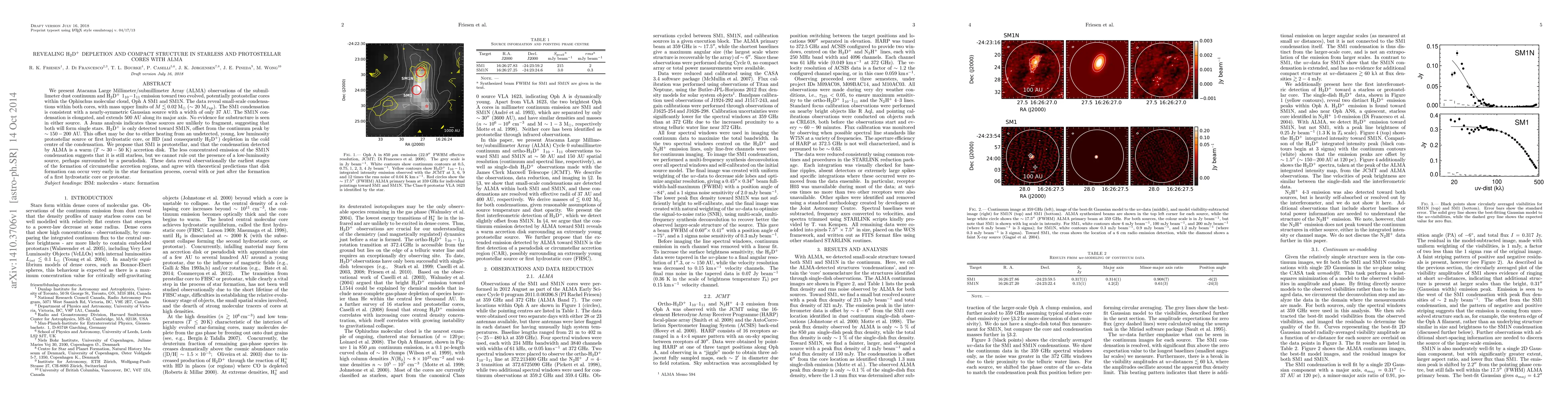 We present Atacama Large Millimeter/submillimeter Array (ALMA) observations of the submillimeter dust continuum and H2D+ 1_{10}-1_{11} emission toward two evolved, potentially protostellar cores within the Ophiuchus molecular cloud, Oph A SM1 and SM1N. The data reveal small-scale condensations within both cores, with mass upper limits of M <~ 0.02M_Sun (~ 20 M_Jup). The SM1 condensation is consistent with a nearly-symmetric Gaussian source with a width of only 37 AU. The SM1N condensation is elongated, and extends 500 AU along its major axis. No evidence for substructure is seen in either source. A Jeans analysis indicates these sources are unlikely to fragment, suggesting that both will form single stars. H2D+ is only detected toward SM1N, offset from the continuum peak by ~150-200 AU. This offset may be due to either heating from an undetected, young, low luminosity protostellar source or first hydrostatic core, or HD (and consequently H2D+) depletion in the cold centre of the condensation. We propose that SM1 is protostellar, and that the condensation detected by ALMA is a warm (T ~ 30-50 K) accretion disk. The less concentrated emission of the SM1N condensation suggests that it is still starless, but we cannot rule out the presence of a low-luminosity source, perhaps surrounded by a pseudodisk. These data reveal observationally the earliest stages of the formation of circumstellar accretion regions, and agree with theoretical predictions that disk formation can occur very early in the star formation process, coeval with or just after the formation of a first hydrostatic core or protostar.
