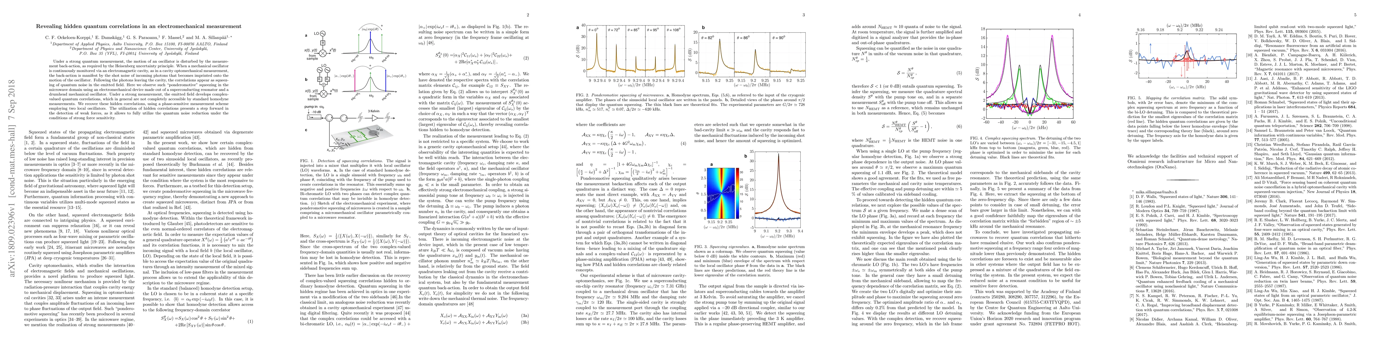 Under a strong quantum measurement, the motion of an oscillator is disturbed by the measurement back-action, as required by the Heisenberg uncertainty principle. When a mechanical oscillator is continuously monitored via an electromagnetic cavity, as in a cavity optomechanical measurement, the back-action is manifest by the shot noise of incoming photons that becomes imprinted onto the motion of the oscillator. Following the photons leaving the cavity, the correlations appear as squeezing of quantum noise in the emitted field. Here we observe such "ponderomotive" squeezing in the microwave domain using an electromechanical device made out of a superconducting resonator and a drumhead mechanical oscillator. Under a strong measurement, the emitted field develops complex-valued quantum correlations, which in general are not completely accessible by standard homodyne measurements. We recover these hidden correlations, using a phase-sensitive measurement scheme employing two local oscillators. The utilization of hidden correlations presents a step forward in the detection of weak forces, as it allows to fully utilize the quantum noise reduction under the conditions of strong force sensitivity.