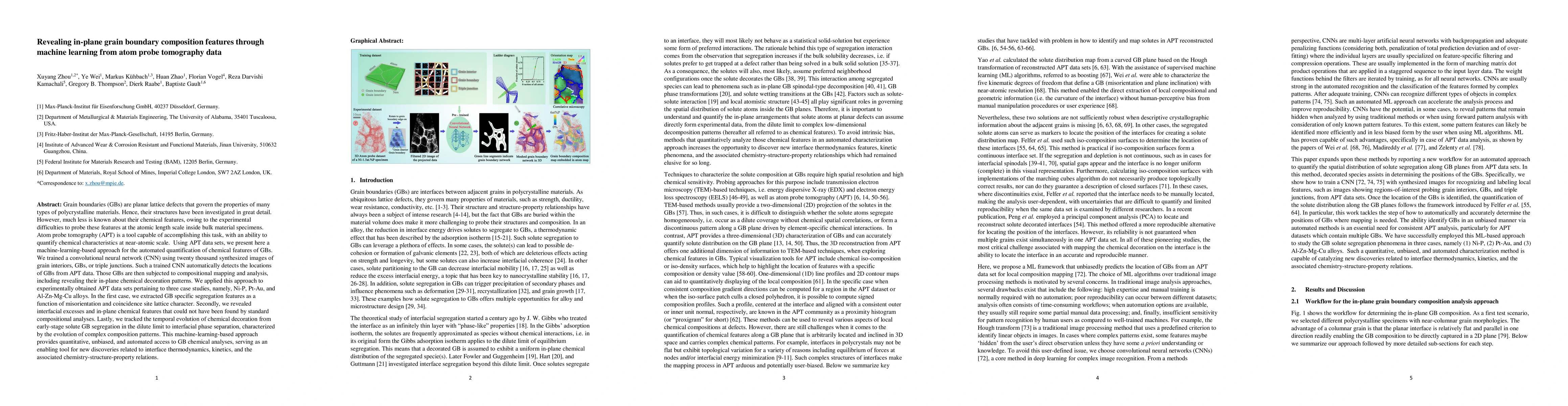 This research paper explores the use of machine learning, specifically convolutional neural networks (CNNs), to analyze grain boundary (GB) composition features from atom probe tomography (APT) data. The study automates the detection and compositional mapping of GBs, revealing in-plane chemical decoration patterns that were previously difficult to identify. The approach was tested on APT datasets from Ni-P, Pt-Au, and Al-Zn-Mg-Cu alloys, demonstrating its potential to uncover new insights into interface thermodynamics, kinetics, and chemistry-structure-property relationships.