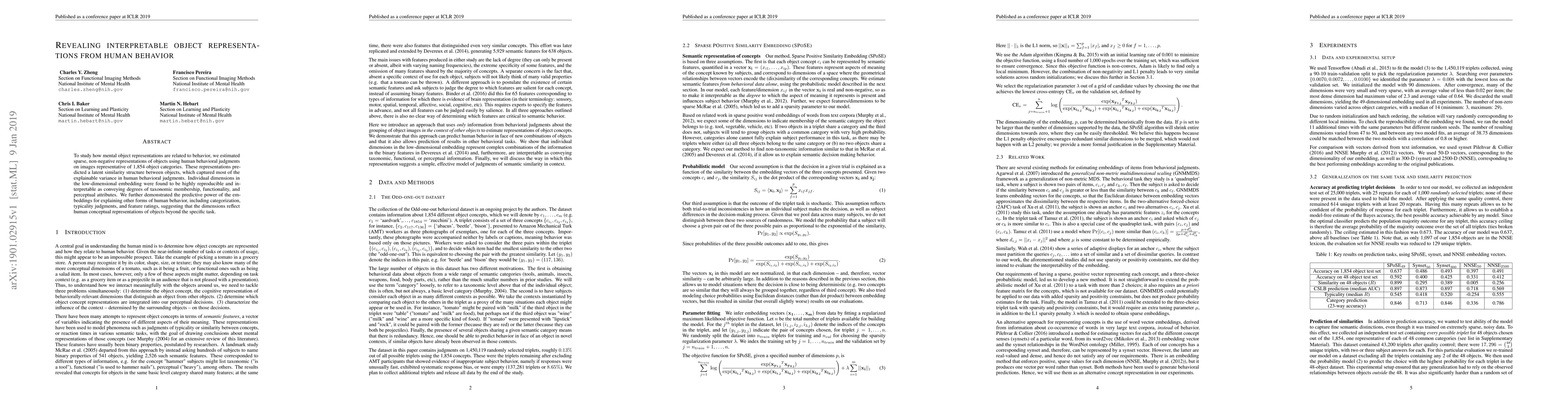 This study estimates sparse, non-negative object representations from human behavioral judgments, revealing a latent similarity structure that explains most variance in human responses. The low-dimensional embeddings are interpretable, reflecting taxonomic membership, functionality, and perceptual attributes, and predict various forms of human behavior beyond the specific task.
