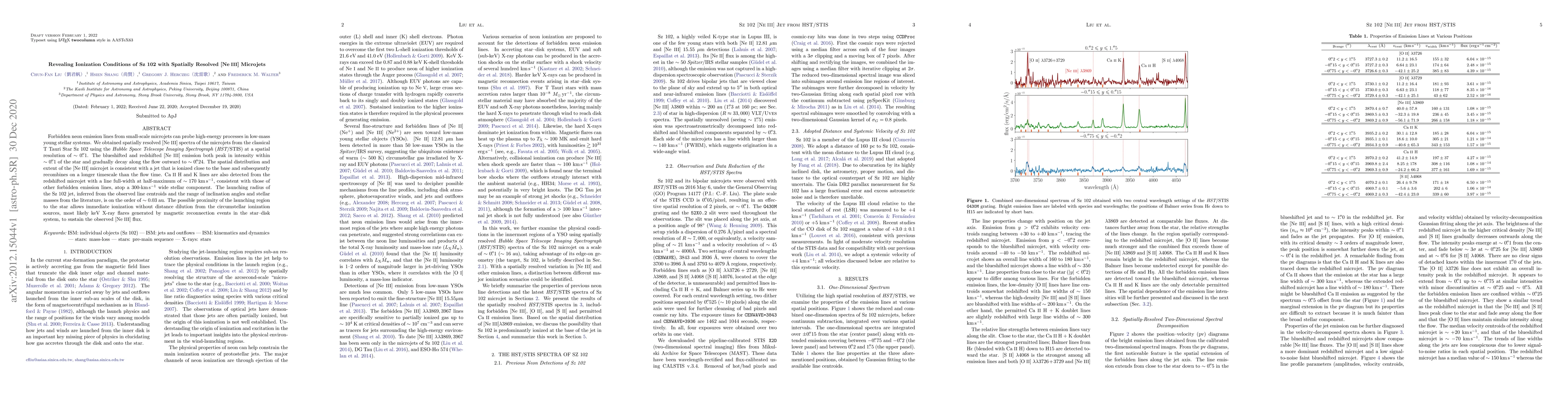 Forbidden neon emission lines from small-scale microjets can probe high-energy processes in low-mass young stellar systems. We obtained spatially resolved [Ne III] spectra of the microjets from the classical T Tauri Star Sz 102 using the Hubble Space Telescope Imaging Spectrograph (HST/STIS) at a spatial resolution of ~0".1. The blueshifted and redshifted [Ne III] emission both peak in intensity within ~0".1 of the star and gradually decay along the flow outward to ~0".24. The spatial distribution and extent of the [Ne III] microjet is consistent with a jet that is ionized close to the base and subsequently recombines on a longer timescale than the flow time. Ca II H and K lines are also detected from the redshifted microjet with a line full-width at half-maximum of ~170 km/s, consistent with those of other forbidden emission lines, atop a 300-km/s wide stellar component. The launching radius of the Sz 102 jet, inferred from the observed line centroids and the range of inclination angles and stellar masses from the literature, is on the order of ~0.03 au. The possible proximity of the launching region to the star allows immediate ionization without distance dilution from the circumstellar ionization sources, most likely keV X-ray flares generated by magnetic reconnection events in the star-disk system, to sustain the observed [Ne III] flux.