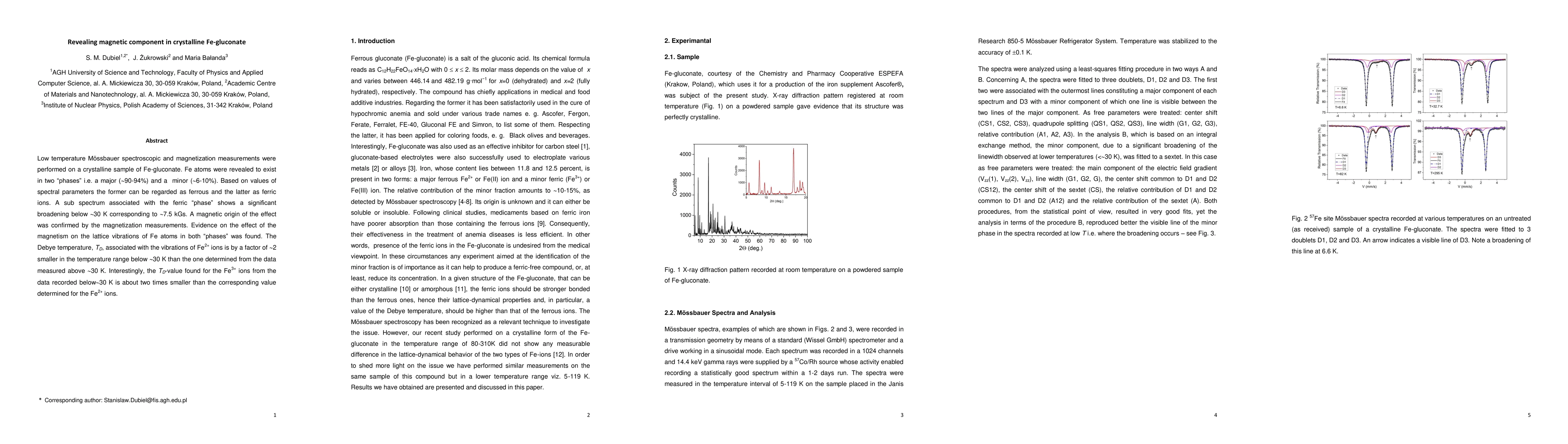Low temperature M\"ossbauer spectroscopic and magnetization measurements were performed on a crystalline sample of Fe-gluconate. Fe atoms were revealed to exist in two phases i.e. a major (90-94 pct.) and a minor (6-10 pct.). Based on values of spectral parameters the former can be regarded as ferrous and the latter as ferric. A sub spectrum associated with the ferric phase shows a significant broadening below ca. 30 K corresponding to 7.5 kGs. A magnetic origin of the effect was confirmed by the magnetization measurements. Evidence on the effect of the magnetism on the lattice vibrations of Fe atoms in both components was found. The Debye temperature, T_D, associated with the vibrations of Fe2+ ions is by a factor of about 2 smaller in the temperature range below ca. 30 K than the one determined from the data measured above ca. 30 K. Interestingly, the T_D-value found for the Fe3+ ions from the data recorded below ca.30 K is about two times smaller than the corresponding value determined for the Fe2+ ions.