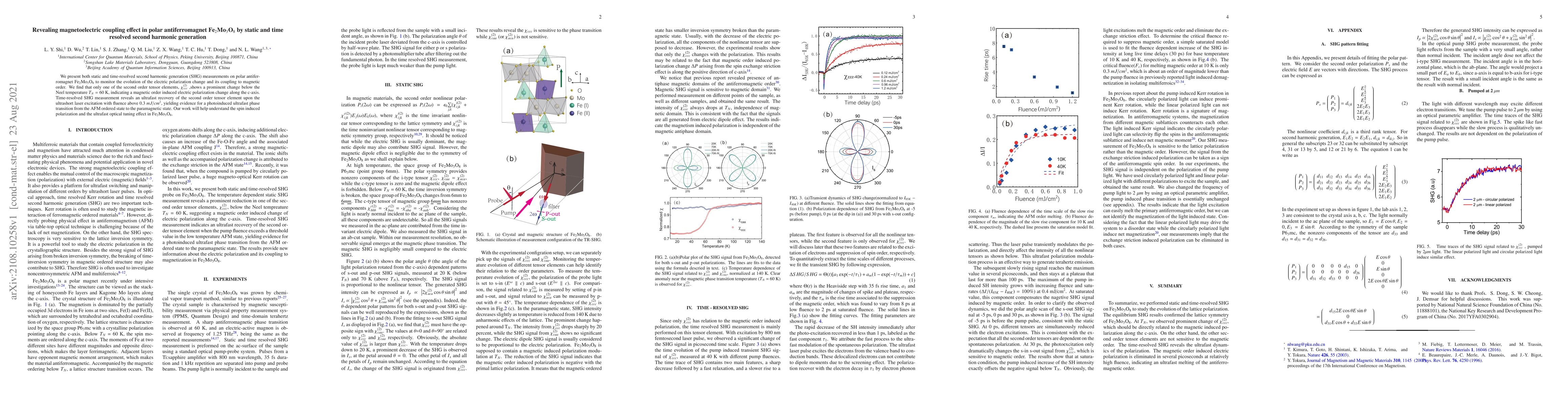 We present both static and time-resolved second harmonic generation (SHG) measurements on polar antiferromagnet Fe$_2$Mo$_3$O$_8$ to monitor the evolution of the electric polarization change and its coupling to magnetic order. We find that only one of the second order tensor elements, $\chi_{ccc}^{(2)}$ ,shows a prominent change below the Neel temperature $T_N = 60$ K, indicating a magnetic order induced electric polarization change along the c-axis. Time-resolved SHG measurement reveals an ultrafast recovery of the second order tensor element upon the ultrashort laser excitation with fluence above 0.3 $mJ/cm^2$, yielding evidence for a photoinduced ultrafast phase transition from the AFM ordered state to the paramagnetic state. Our work will help understand the spin induced polarization and the ultrafast optical tuning effect in Fe$_{2}$Mo$_{3}$O$_{8}$.