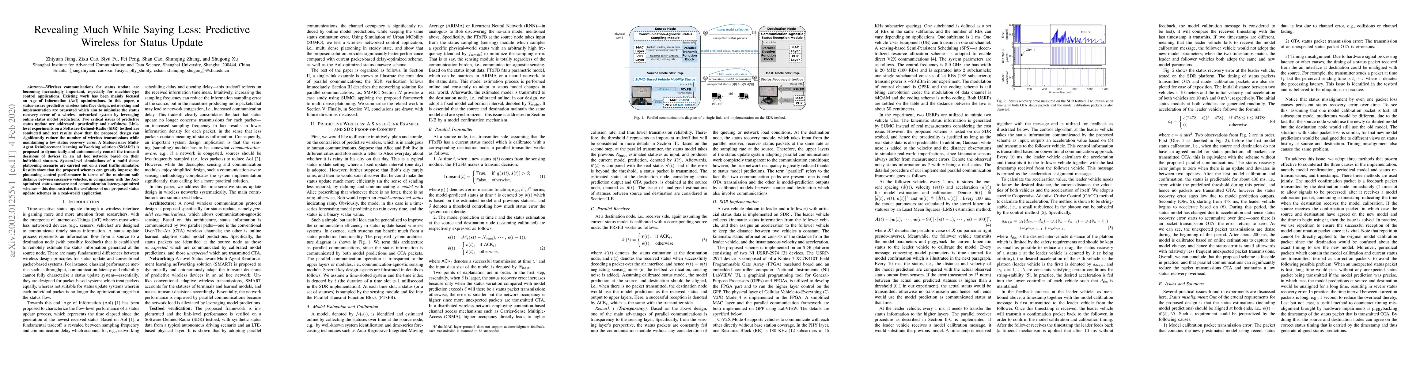 This paper introduces a predictive wireless interface for status updates that minimizes recovery error through online status model predictions, significantly reducing wireless transmissions while maintaining low error. The proposed SMART solution dynamically controls device transmit decisions based on individual statuses, demonstrating improved platooning control performance in simulations.