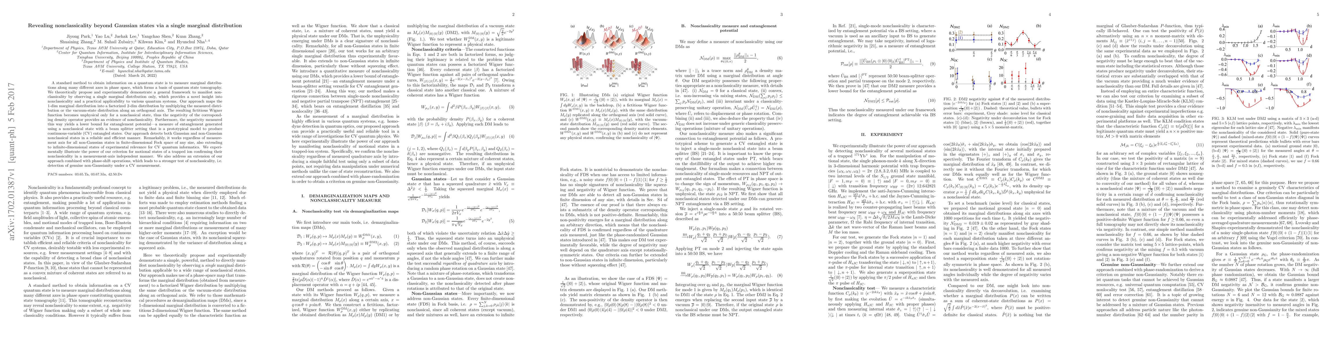 A standard method to obtain information on a quantum state is to measure marginal distributions along many different axes in phase space, which forms a basis of quantum state tomography. We theoretically propose and experimentally demonstrate a general framework to manifest nonclassicality by observing a single marginal distribution only, which provides a novel insight into nonclassicality and a practical applicability to various quantum systems. Our approach maps the 1-dim marginal distribution into a factorized 2-dim distribution by multiplying the measured distribution or the vacuum-state distribution along an orthogonal axis. The resulting fictitious Wigner function becomes unphysical only for a nonclassical state, thus the negativity of the corresponding density operator provides an evidence of nonclassicality. Furthermore, the negativity measured this way yields a lower bound for entanglement potential---a measure of entanglement generated using a nonclassical state with a beam splitter setting that is a prototypical model to produce continuous-variable (CV) entangled states. Our approach detects both Gaussian and non-Gaussian nonclassical states in a reliable and efficient manner. Remarkably, it works regardless of measurement axis for all non-Gaussian states in finite-dimensional Fock space of any size, also extending to infinite-dimensional states of experimental relevance for CV quantum informatics. We experimentally illustrate the power of our criterion for motional states of a trapped ion confirming their nonclassicality in a measurement-axis independent manner. We also address an extension of our approach combined with phase-shift operations, which leads to a stronger test of nonclassicality, i.e. detection of genuine non-Gaussianity under a CV measurement.