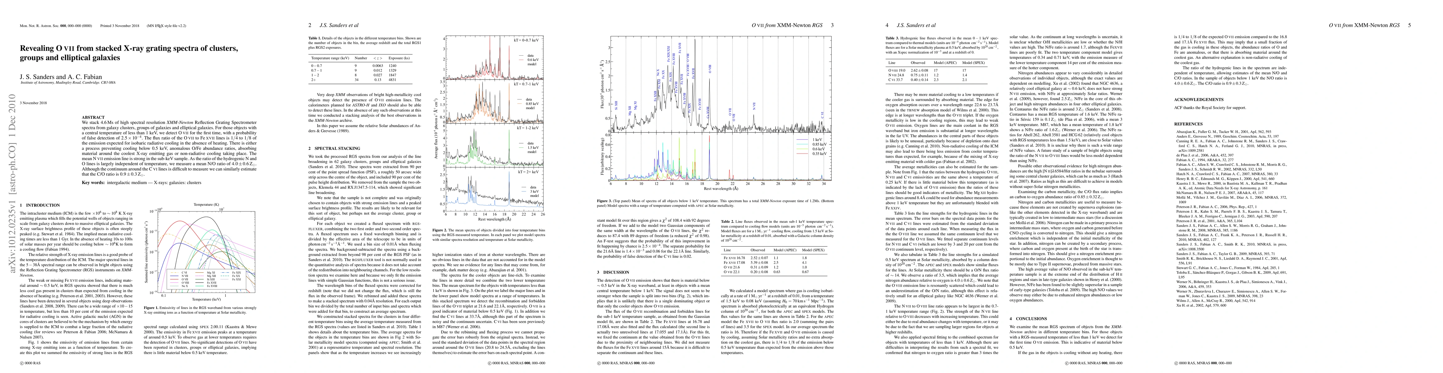 We stack 4.6 Ms of high spectral resolution XMM-Newton Reflection Grating Spectrometer spectra from galaxy clusters, groups of galaxies and elliptical galaxies. For those objects with a central temperature of less than 1 keV, we detect O VII for the first time, with a probability of false detection of 2.5x10^-4. The flux ratio of the O VII to Fe XVII lines is 1/4 to 1/8 of the emission expected for isobaric radiative cooling in the absence of heating. There is either a process preventing cooling below 0.5 keV, anomalous O/Fe abundance ratios, absorbing material around the coolest X-ray emitting gas or non-radiative cooling taking place. The mean N VII emission line is strong in the sub-keV sample. As the ratio of the hydrogenic N and O lines is largely independent of temperature, we measure a mean N/O ratio of 4.0 +- 0.6 Solar. Although the continuum around the C VI lines is difficult to measure we can similarly estimate that the C/O ratio is 0.9 +- 0.3 Solar.