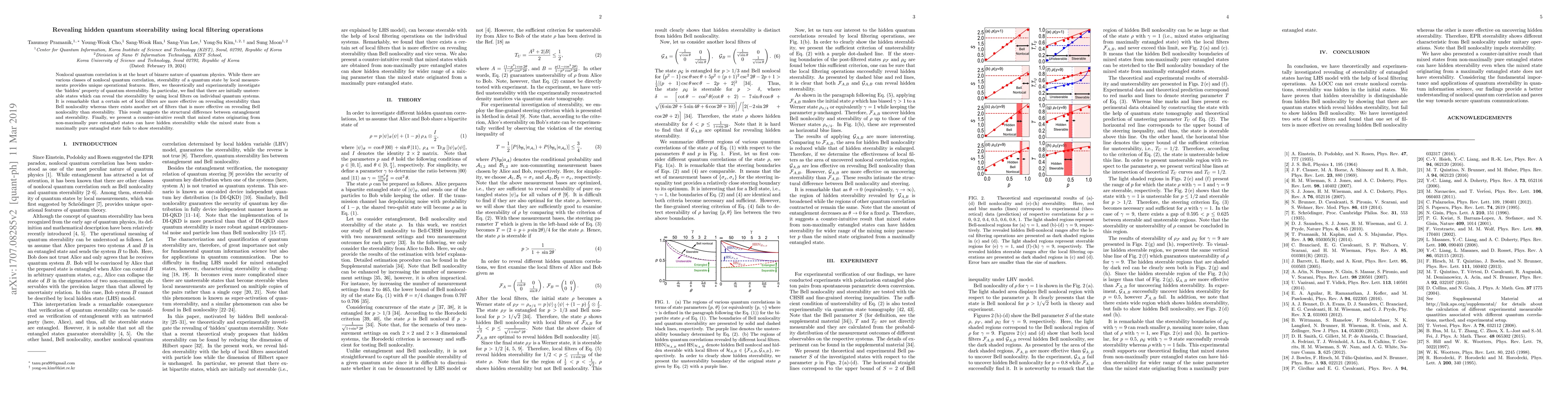 Nonlocal quantum correlation is at the heart of bizarre nature of quantum physics. While there are various classes of nonlocal quantum correlation, steerability of a quantum state by local measurements provides unique operational features. Here, we theoretically and experimentally investigate the hidden quantum steerability. In particular, we find that there are initially unsteerable states which can reveal the steerability by using local filters on individual quantum systems. It is remarkable that a certain set of local filters are more effective on revealing steerability than Bell nonlocality whereas there exists another set of filters that is more effective on revealing Bell nonlocality than steerability. Finally, we present a counter-intuitive result that mixed states originating from non-maximally pure entangled states can have hidden steerability while the mixed state from a maximally pure entangled state fails to show steerability.