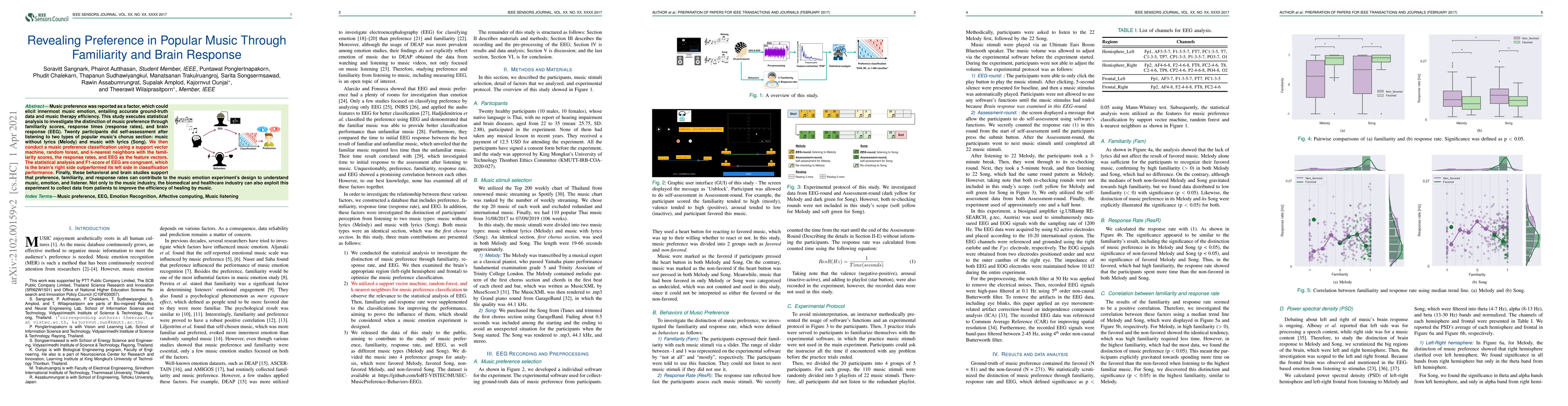 This study explores music preference through familiarity scores, response times, and EEG brain responses, finding that the right side of the brain outperforms the left in classification. The research supports that preference, familiarity, and response rates are crucial for understanding music emotions and can benefit both the music and healthcare industries.