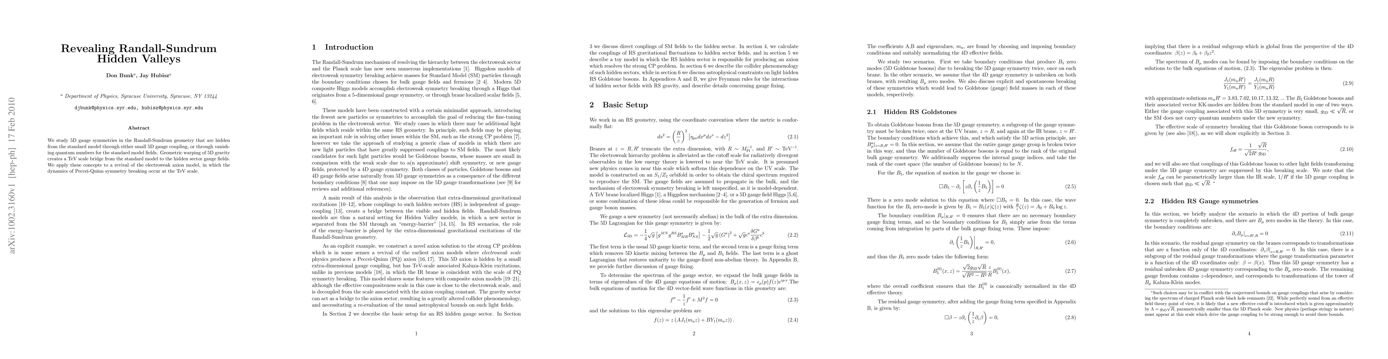 We study 5D gauge symmetries in the Randall-Sundrum geometry that are hidden from the standard model through either small 5D gauge coupling, or through vanishing quantum numbers for the standard model fields. Geometric warping of 5D gravity creates a TeV scale bridge from the standard model to the hidden sector gauge fields. We apply these concepts to a revival of the electroweak axion model, in which the dynamics of Peccei-Quinn symmetry breaking occur at the TeV scale.