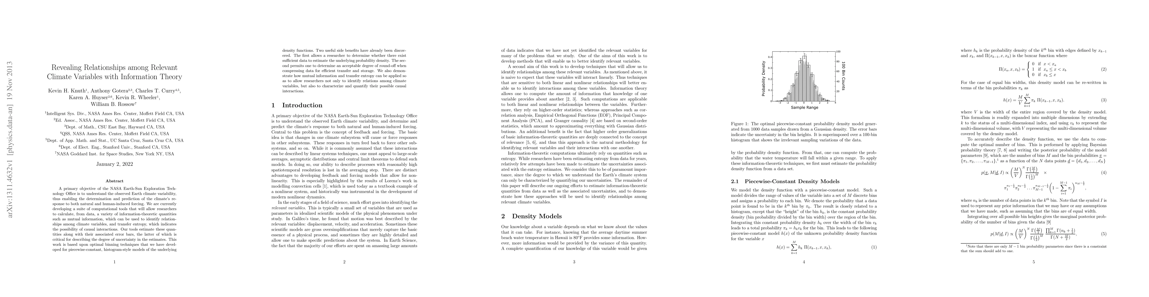 A primary objective of the NASA Earth-Sun Exploration Technology Office is to understand the observed Earth climate variability, thus enabling the determination and prediction of the climate's response to both natural and human-induced forcing. We are currently developing a suite of computational tools that will allow researchers to calculate, from data, a variety of information-theoretic quantities such as mutual information, which can be used to identify relationships among climate variables, and transfer entropy, which indicates the possibility of causal interactions. Our tools estimate these quantities along with their associated error bars, the latter of which is critical for describing the degree of uncertainty in the estimates. This work is based upon optimal binning techniques that we have developed for piecewise-constant, histogram-style models of the underlying density functions. Two useful side benefits have already been discovered. The first allows a researcher to determine whether there exist sufficient data to estimate the underlying probability density. The second permits one to determine an acceptable degree of round-off when compressing data for efficient transfer and storage. We also demonstrate how mutual information and transfer entropy can be applied so as to allow researchers not only to identify relations among climate variables, but also to characterize and quantify their possible causal interactions.