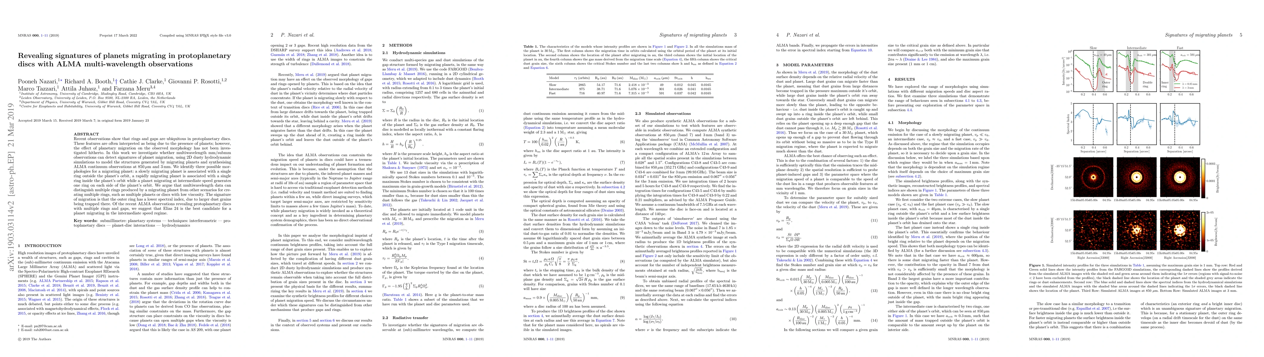 This study uses ALMA multiwavelength observations and 2D simulations to reveal signatures of planet migration in protoplanetary discs, identifying distinct morphologies linked to different migration speeds. The findings suggest that multiwavelength data can distinguish migrating planets from other ring-forming scenarios, with Elias 24 proposed as a candidate for intermediate-speed migration.