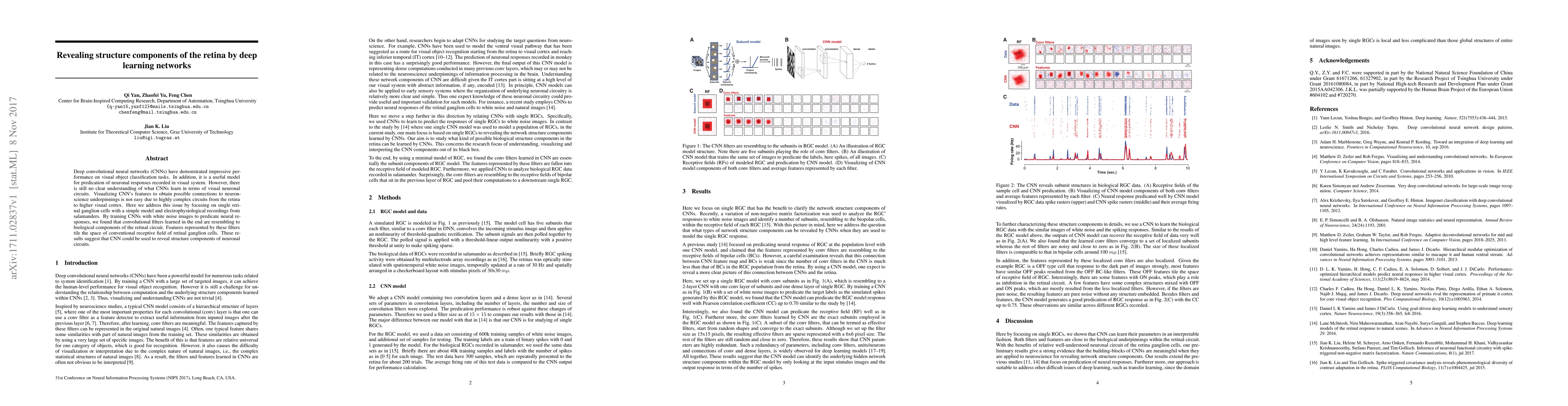 Deep convolutional neural networks (CNNs) have demonstrated impressive performance on visual object classification tasks. In addition, it is a useful model for predication of neuronal responses recorded in visual system. However, there is still no clear understanding of what CNNs learn in terms of visual neuronal circuits. Visualizing CNN's features to obtain possible connections to neuronscience underpinnings is not easy due to highly complex circuits from the retina to higher visual cortex. Here we address this issue by focusing on single retinal ganglion cells with a simple model and electrophysiological recordings from salamanders. By training CNNs with white noise images to predicate neural responses, we found that convolutional filters learned in the end are resembling to biological components of the retinal circuit. Features represented by these filters tile the space of conventional receptive field of retinal ganglion cells. These results suggest that CNN could be used to reveal structure components of neuronal circuits.