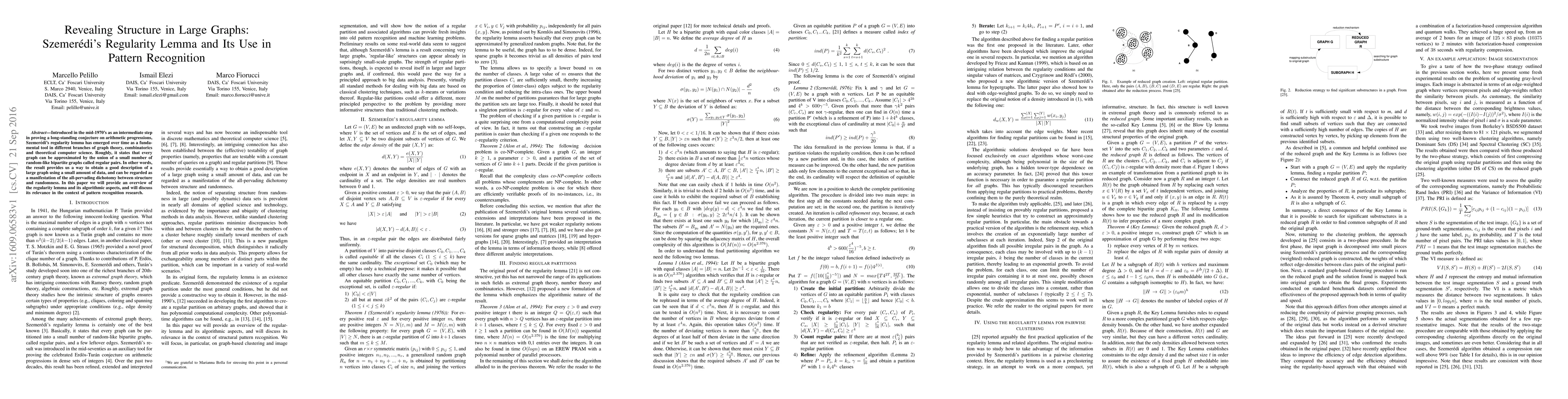 Introduced in the mid-1970's as an intermediate step in proving a long-standing conjecture on arithmetic progressions, Szemer\'edi's regularity lemma has emerged over time as a fundamental tool in different branches of graph theory, combinatorics and theoretical computer science. Roughly, it states that every graph can be approximated by the union of a small number of random-like bipartite graphs called regular pairs. In other words, the result provides us a way to obtain a good description of a large graph using a small amount of data, and can be regarded as a manifestation of the all-pervading dichotomy between structure and randomness. In this paper we will provide an overview of the regularity lemma and its algorithmic aspects, and will discuss its relevance in the context of pattern recognition research.