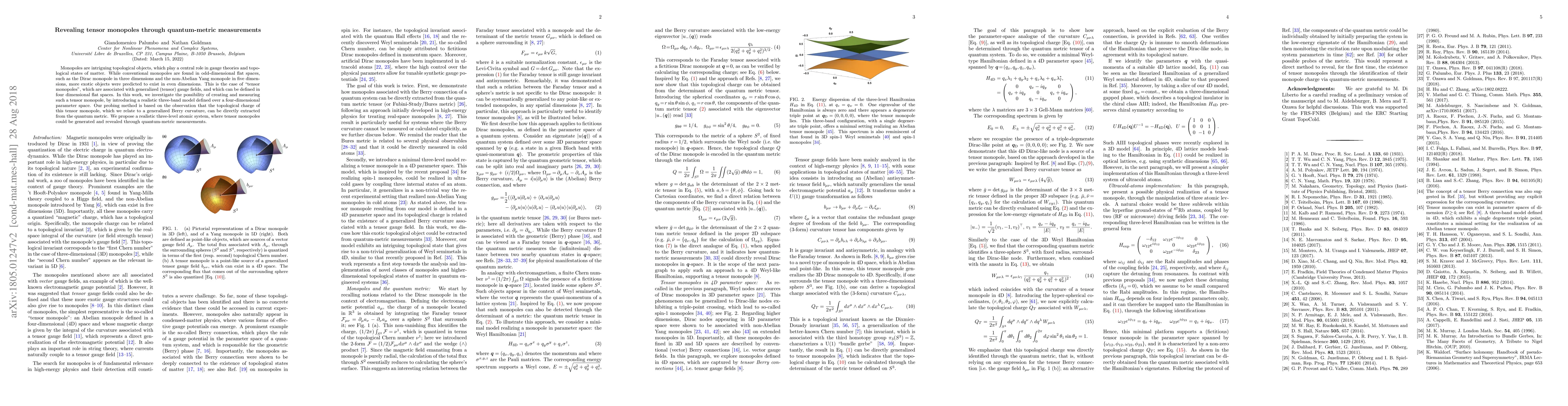 This paper explores the creation and measurement of tensor monopoles, exotic topological objects linked to generalized gauge fields in four-dimensional spaces. It proposes a three-band model and suggests that tensor monopoles can be detected by measuring the quantum metric, utilizing a three-level atomic system for practical observation.