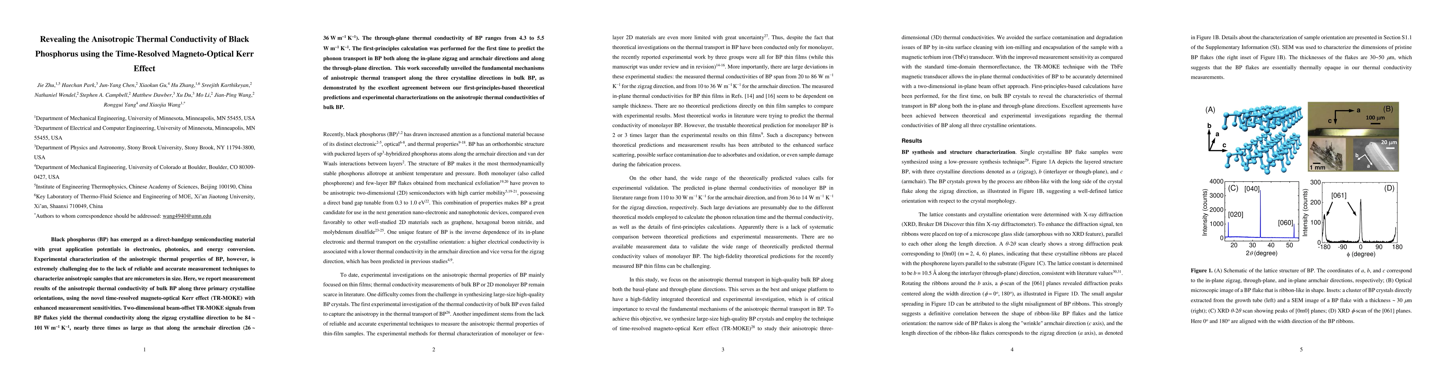 Black phosphorus (BP) has emerged as a direct-bandgap semiconducting material with great application potentials in electronics, photonics, and energy conversion. Experimental characterization of the anisotropic thermal properties of BP, however, is extremely challenging due to the lack of reliable and accurate measurement techniques to characterize anisotropic samples that are micrometers in size. Here, we report measurement results of the anisotropic thermal conductivity of bulk BP along three primary crystalline orientations, using the novel time-resolved magneto-optical Kerr effect (TR-MOKE) with enhanced measurement sensitivities. Two-dimensional beam-offset TR-MOKE signals from BP flakes yield the thermal conductivity along the zigzag crystalline direction to be 84 ~ 101 W/(m*K), nearly three times as large as that along the armchair direction (26 ~ 36 W/(m*K)). The through-plane thermal conductivity of BP ranges from 4.3 to 5.5 W/(m*K). The first-principles calculation was performed for the first time to predict the phonon transport in BP both along the in-plane zigzag and armchair directions and along the through-plane direction. This work successfully unveiled the fundamental mechanisms of anisotropic thermal transport along the three crystalline directions in bulk BP, as demonstrated by the excellent agreement between our first-principles-based theoretical predictions and experimental characterizations on the anisotropic thermal conductivities of bulk BP.