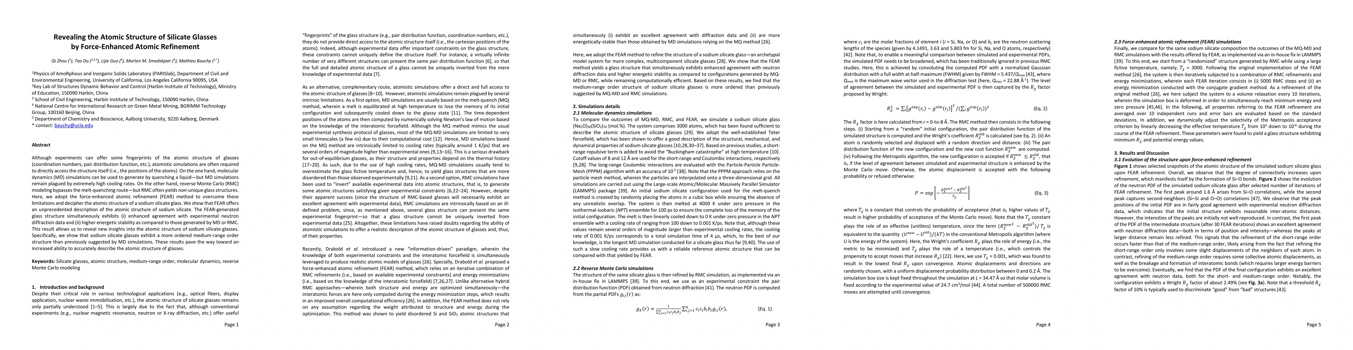 The paper introduces the force-enhanced atomic refinement (FEAR) method to reveal the atomic structure of sodium silicate glasses, achieving better agreement with experimental data and higher energetic stability compared to molecular dynamics and reverse Monte Carlo methods. FEAR reveals a more ordered medium-range structure than previously suggested, enhancing our understanding of silicate glass atomic structures.