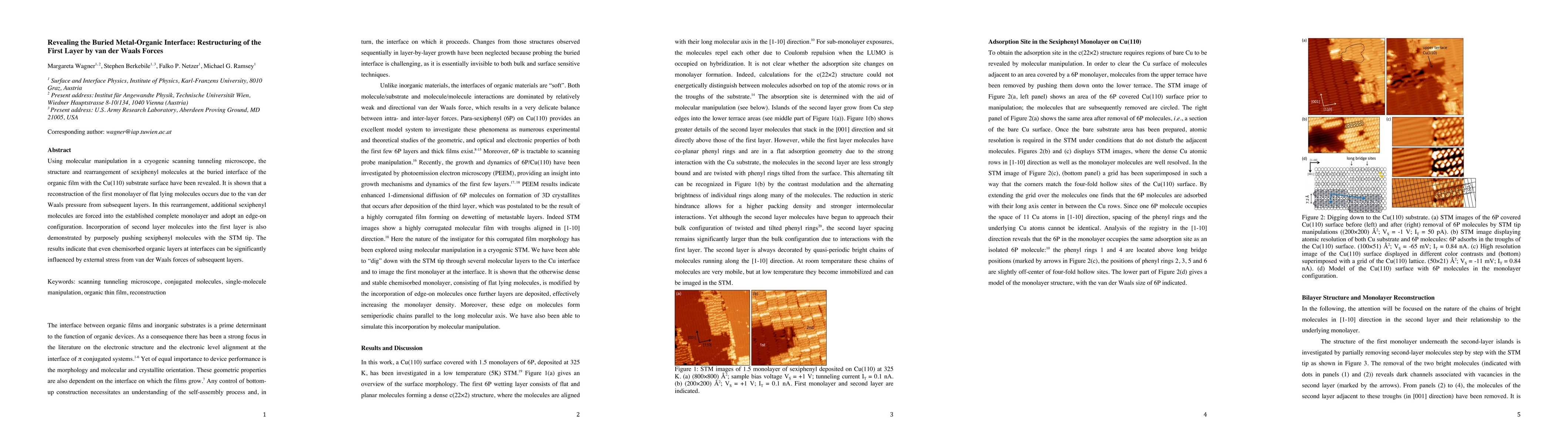 This study reveals how van der Waals forces induce a restructuring of the first monolayer of sexiphenyl molecules at the buried metal-organic interface between an organic film and a Cu(110) substrate, causing flat-lying molecules to adopt an edge-on configuration. The findings demonstrate that external stress from subsequent layers can significantly influence chemisorbed organic layers at interfaces.