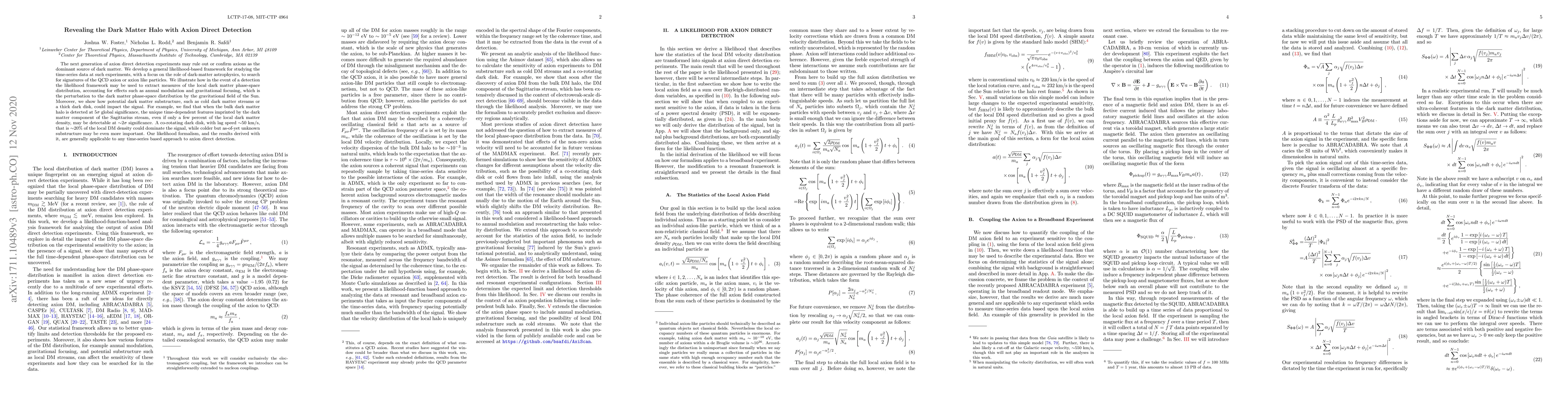The next generation of axion direct detection experiments may rule out or confirm axions as the dominant source of dark matter. We develop a general likelihood-based framework for studying the time-series data at such experiments, with a focus on the role of dark-matter astrophysics, to search for signatures of the QCD axion or axion like particles. We illustrate how in the event of a detection the likelihood framework may be used to extract measures of the local dark matter phase-space distribution, accounting for effects such as annual modulation and gravitational focusing, which is the perturbation to the dark matter phase-space distribution by the gravitational field of the Sun. Moreover, we show how potential dark matter substructure, such as cold dark matter streams or a thick dark disk, could impact the signal. For example, we find that when the bulk dark matter halo is detected at 5$\sigma$ global significance, the unique time-dependent features imprinted by the dark matter component of the Sagittarius stream, even if only a few percent of the local dark matter density, may be detectable at $\sim$2$\sigma$ significance. A co-rotating dark disk, with lag speed $\sim$50 km$/$s, that is $\sim$20$\%$ of the local DM density could dominate the signal, while colder but as-of-yet unknown substructure may be even more important. Our likelihood formalism, and the results derived with it, are generally applicable to any time-series based approach to axion direct detection.