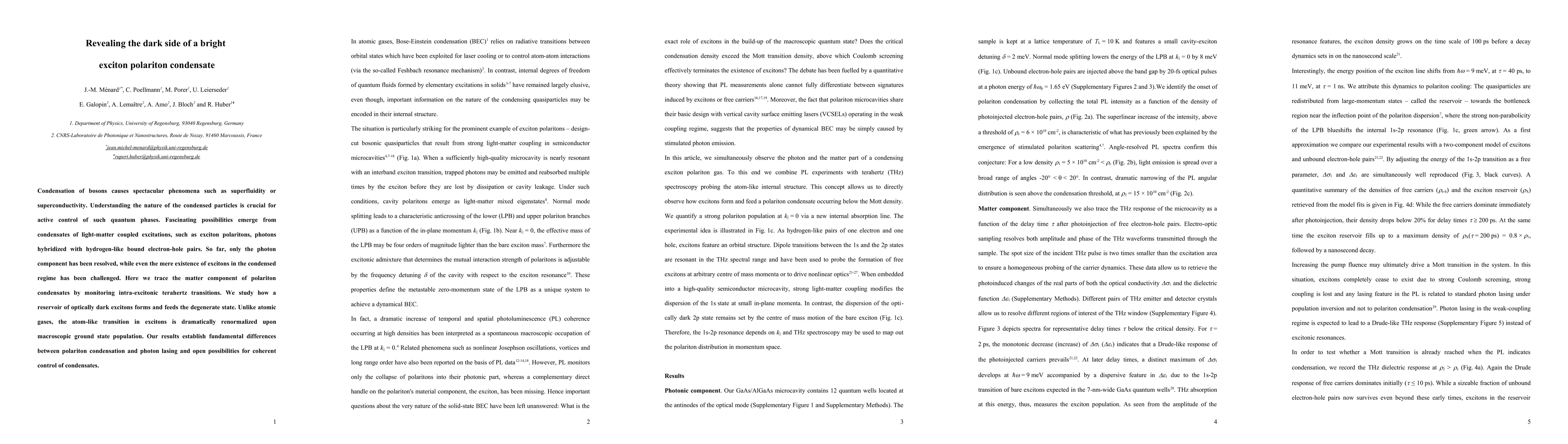 Condensation of bosons causes spectacular phenomena such as superfluidity or superconductivity. Understanding the nature of the condensed particles is crucial for active control of such quantum phases. Fascinating possibilities emerge from condensates of light-matter coupled excitations, such as exciton polaritons, photons hybridized with hydrogen-like bound electron-hole pairs. So far, only the photon component has been resolved, while even the mere existence of excitons in the condensed regime has been challenged. Here we trace the matter component of polariton condensates by monitoring intra-excitonic terahertz transitions. We study how a reservoir of optically dark excitons forms and feeds the degenerate state. Unlike atomic gases, the atom-like transition in excitons is dramatically renormalized upon macroscopic ground state population. Our results establish fundamental differences between polariton condensation and photon lasing and open possibilities for coherent control of condensates.