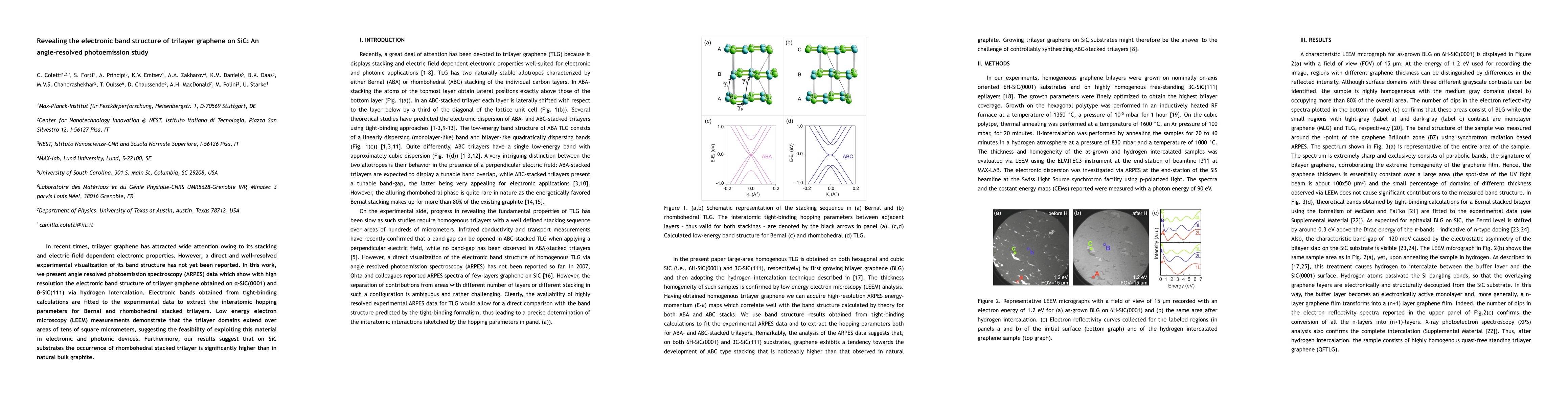 This study utilizes angle-resolved photoemission spectroscopy (ARPES) to reveal the electronic band structure of trilayer graphene on SiC substrates, providing high-resolution data that fit well with tight-binding calculations. The findings suggest enhanced rhombohedral stacking on SiC compared to bulk graphite, with implications for device applications.