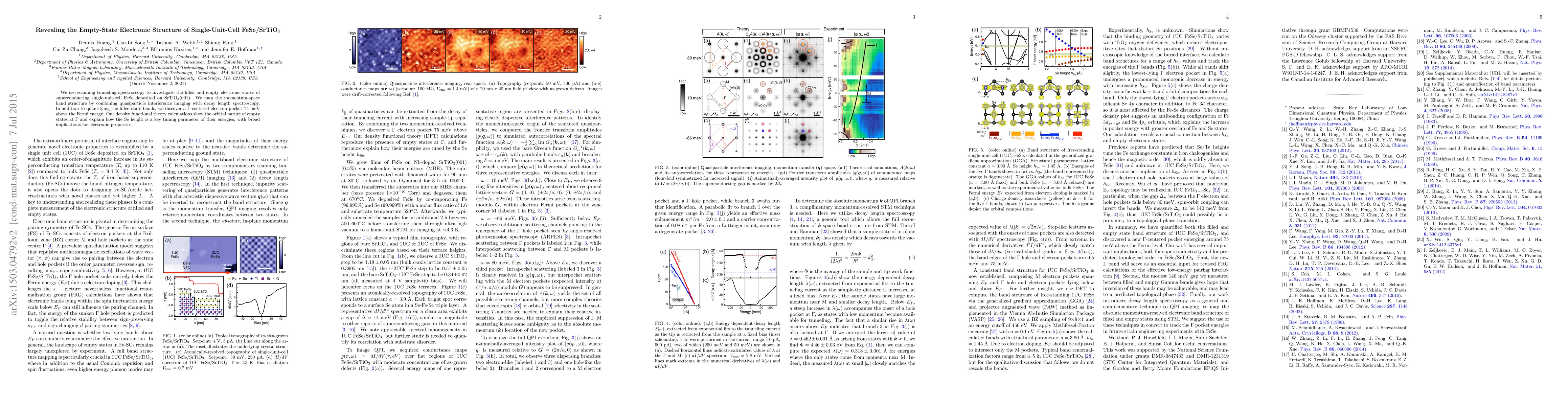 The research uses scanning tunneling spectroscopy to explore the electronic states of superconducting single-unit-cell FeSe on SrTiO3. It uncovers a $Gamma$-centered electron pocket 75 meV above the Fermi energy, supported by density functional theory calculations indicating Se height as a crucial factor in determining empty state energies, with significant implications for electronic properties.