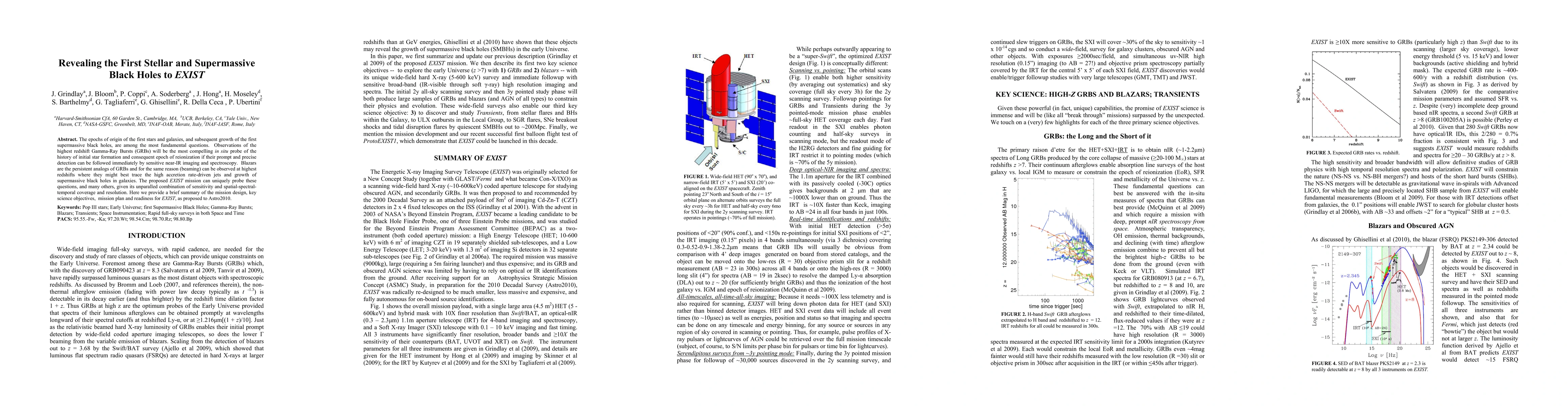 The proposed EXIST mission aims to uncover the first stars, galaxies, and supermassive black holes by observing high-redshift Gamma-Ray Bursts (GRBs) and their persistent analogs, blazars. The mission's unique sensitivity, coverage, and resolution would allow it to probe the history of initial star formation, reionization, and supermassive black hole growth, as outlined in the Astro2010 proposal.
