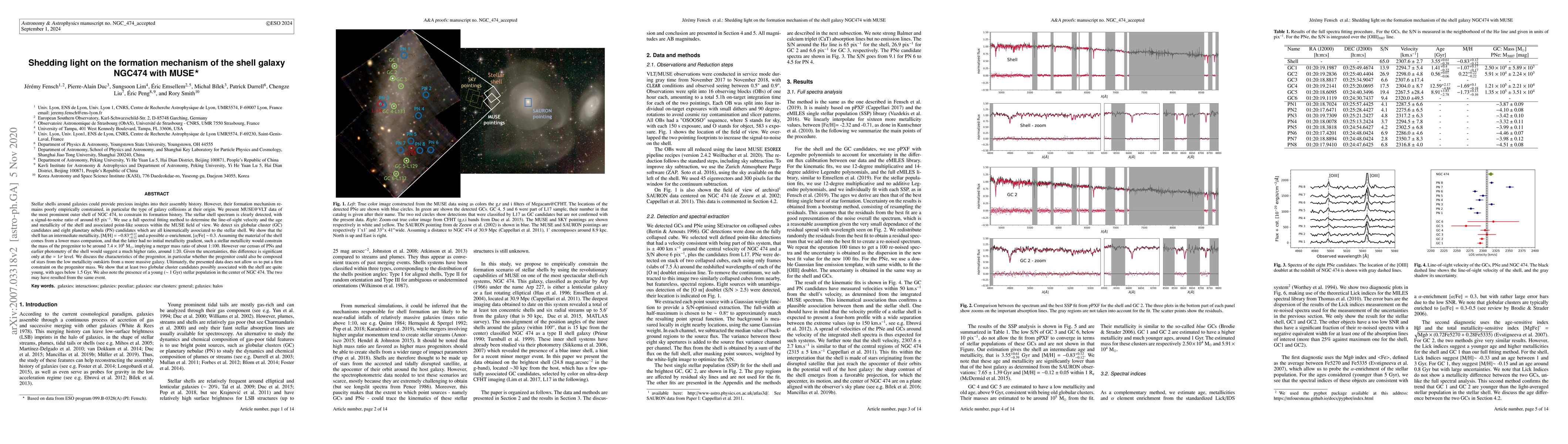 This paper uses MUSE@VLT data to analyze the stellar shell of NGC 474, revealing its intermediate metallicity and possible $\alpha$-enrichment. The study suggests the shell likely formed from a merger involving a lower-mass companion, though the exact merger mass ratio remains uncertain.