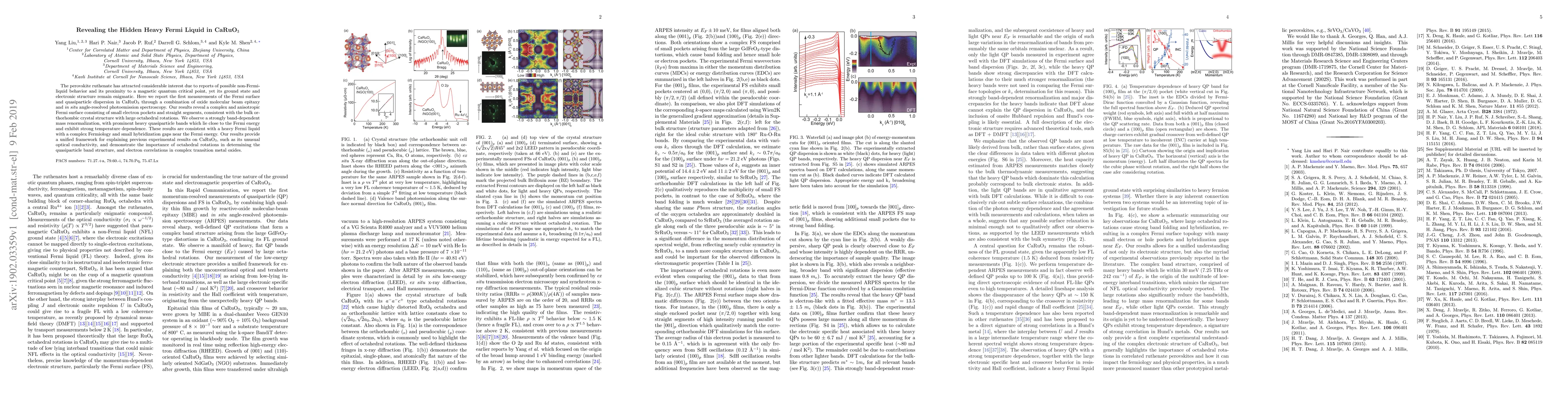 The perovskite ruthenate has attracted considerable interest due to reports of possible non-Fermi-liquid behavior and its proximity to a magnetic quantum critical point, yet its ground state and electronic structure remain enigmatic. Here we report the first measurements of the Fermi surface and quasiparticle dispersion in CaRuO3 through a combination of oxide molecular beam epitaxy and in situ angle-resolved photoemission spectroscopy. Our results reveal a complex and anisotropic Fermi surface consisting of small electron pockets and straight segments, consistent with the bulk orthorhombic crystal structure with large octahedral rotations. We observe a strongly band-dependent mass renormalization, with prominent heavy quasiparticle bands which lie close to the Fermi energy and exhibit strong temperature dependence. These results are consistent with a heavy Fermi liquid with a complex Fermiology and small hybridization gaps near the Fermi energy. Our results provide a unified framework for explaining previous experimental results on CaRuO3, such as its unusual optical conductivity, and demonstrate the importance of octahedral rotations in determining the quasiparticle band structure, and electron correlations in complex transition metal oxides.