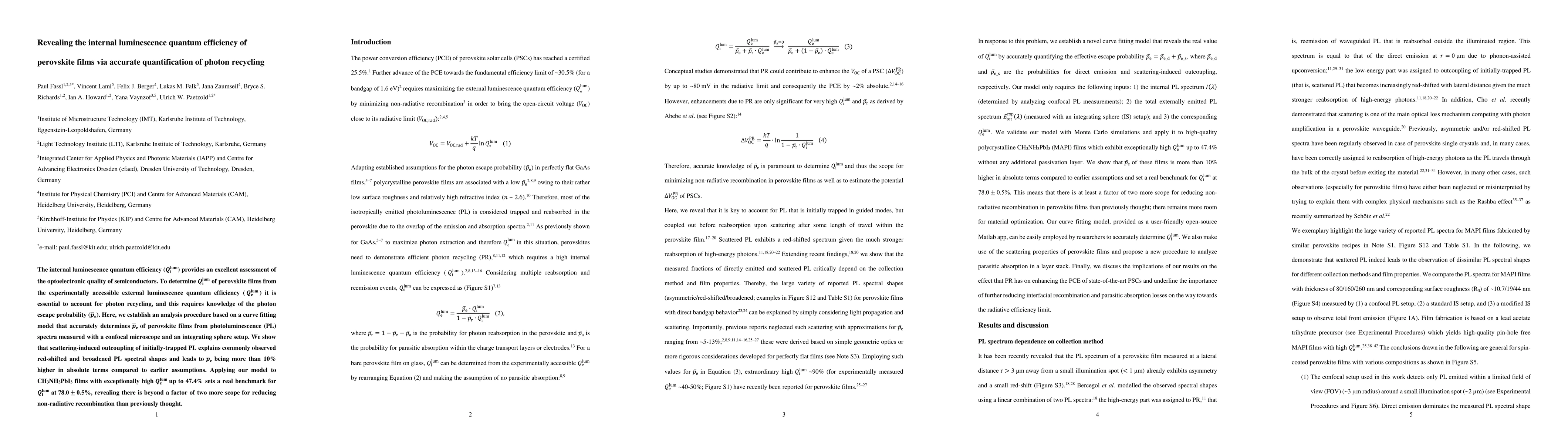 This paper develops a method to accurately determine the internal luminescence quantum efficiency of perovskite films by quantifying photon recycling, revealing that the escape probability is higher than previously assumed, and benchmarks the internal efficiency at 78.0%, indicating significant room for reducing non-radiative recombination.