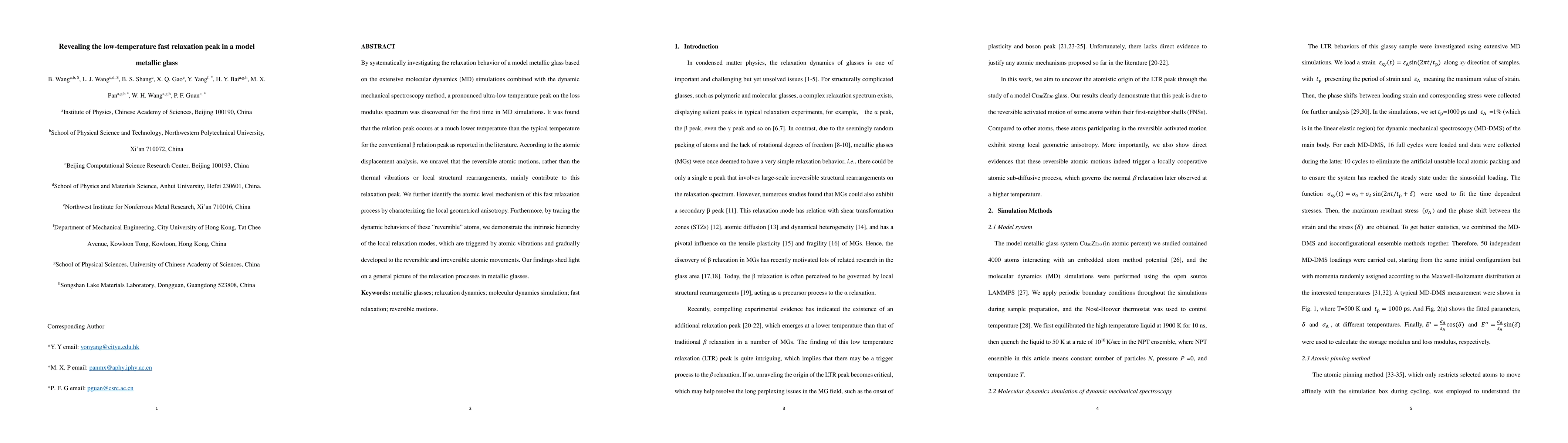 This study reveals an ultra-low temperature relaxation peak in a model metallic glass via molecular dynamics simulations and dynamic mechanical spectroscopy, attributing it to reversible atomic motions rather than thermal vibrations. The research identifies the atomic mechanism and hierarchical relaxation modes, providing insights into relaxation processes in metallic glasses.