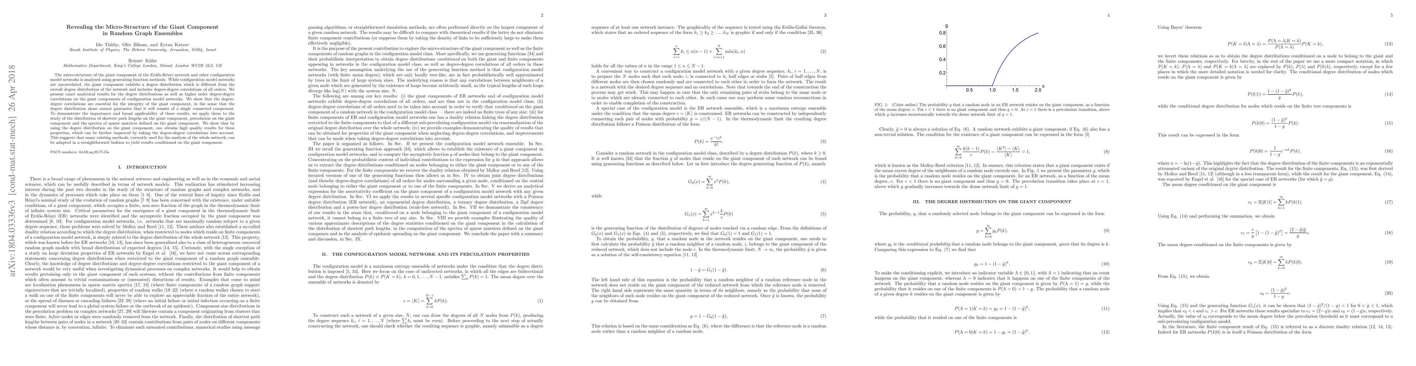 This paper analyzes the micro-structure of the giant component in random graph ensembles, revealing that degree-degree correlations are crucial for its integrity. The study applies generating function methods to derive exact analytical results for degree distributions and higher-order correlations, demonstrating their importance in network properties like shortest path lengths and percolation on the giant component.