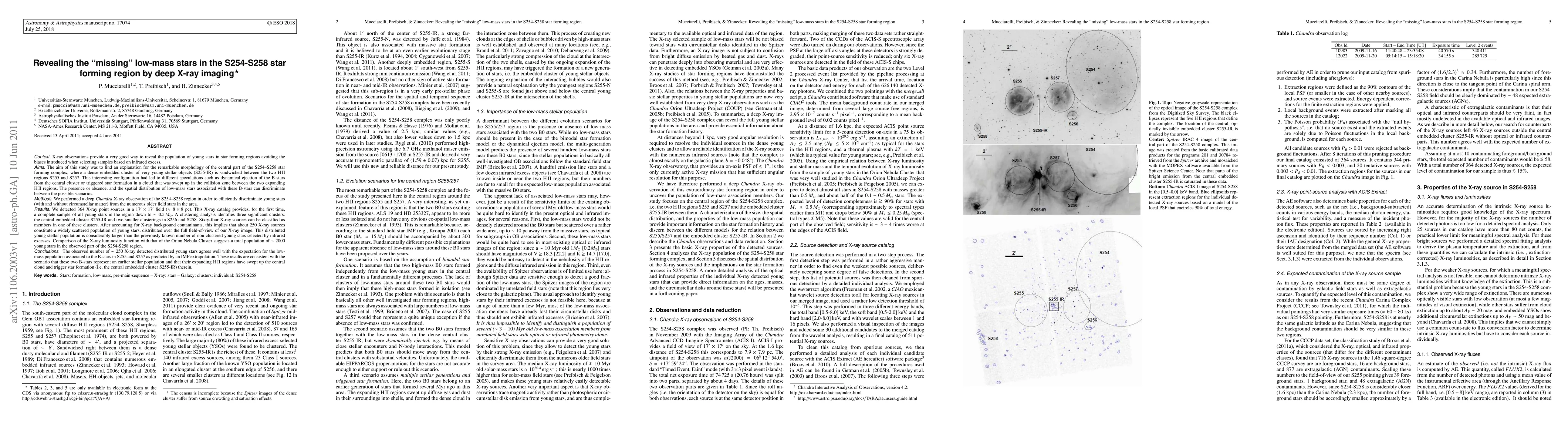 (abbreviated) In the central part of the S254-S258 star forming complex, a dense embedded cluster of very young stellar objects (S255-IR) is sandwiched between the two HII regions S255 and S257. This interesting configuration had led to different speculations such as dynamical ejection of the B-stars from the central cluster or triggered star formation in a cloud that was swept up in the collision zone between the two expanding HII regions. The presence or absence of low-mass stars associated with these B-stars can discriminate between the possible scenarios. We performed a deep Chandra X-ray observation of the S254-S258 region in order to efficiently discriminate young stars from the numerous older field stars in the area. We detected 364 X-ray point sources, providing a complete sample of all young stars in the observed region down to ~0.5 Msun. A clustering analysis identifies three significant clusters, containing 64 X-ray sources in total. After accounting for X-ray background contaminants, this implies that about 250 X-ray sources constitute a widely scattered population of young stars. This number agrees well with the expectation for the low-mass population associated to the B-stars in S255 and S257 as predicted by an IMF extrapolation. These results are consistent with the scenario that these two B-stars represent an earlier stellar population and that their expanding HII regions have swept up the central cloud and trigger star formation therein.