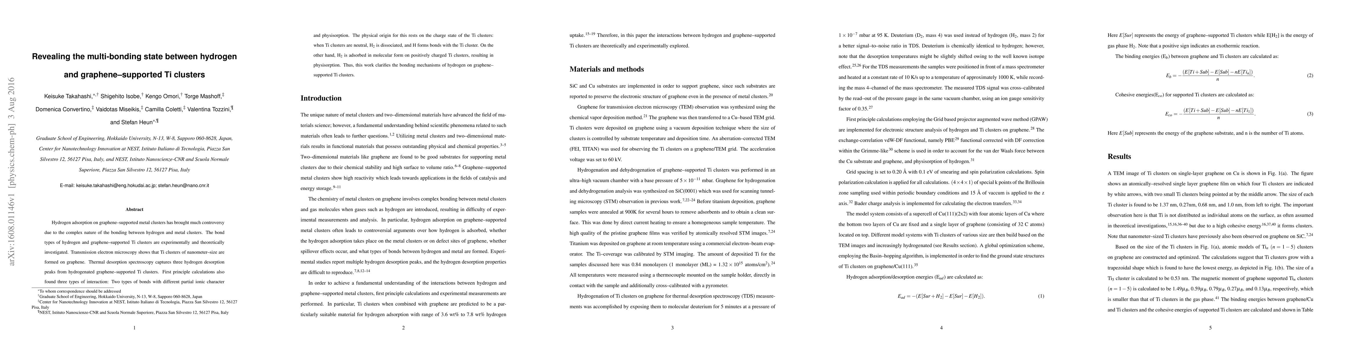This study investigates the complex bonding between hydrogen and graphene-supported Ti clusters using experimental and theoretical methods. It reveals three distinct hydrogen desorption peaks and identifies three types of interactions, depending on the charge state of the Ti clusters, thus clarifying the bonding mechanisms.