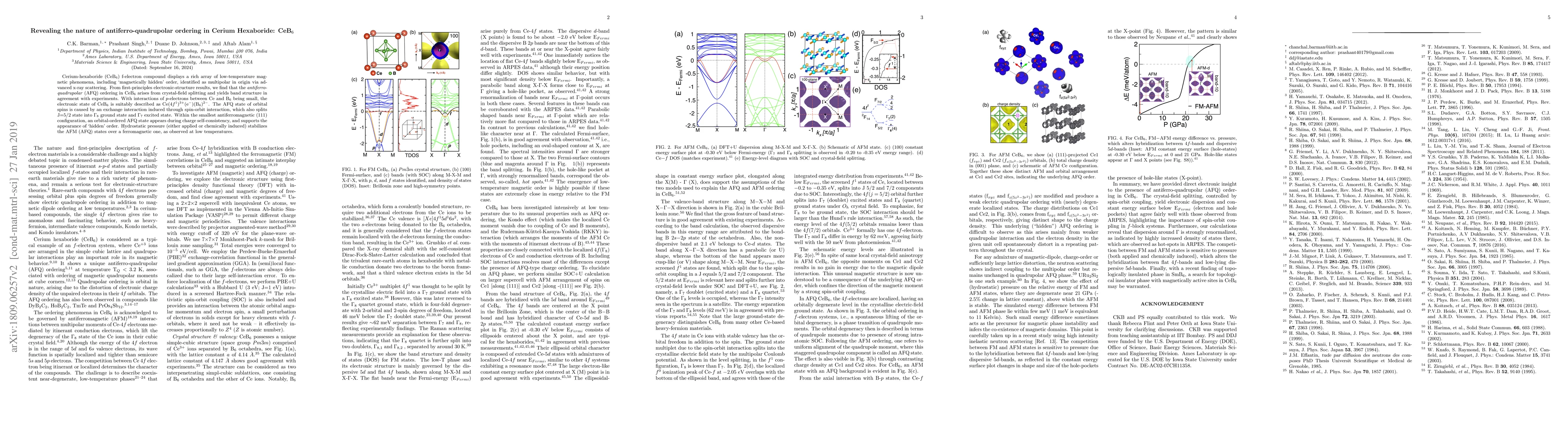 Cerium-hexaboride (CeB$_6$) f-electron compound displays a rich array of low-temperature magnetic phenomena, including `magnetically hidden' order, identified as multipolar in origin via advanced x-ray scattering. From first-principles electronic-structure results, we find that the \emph{antiferro-quadrupolar} (AFQ) ordering in CeB$_{6}$ arises from crystal-field splitting and yields band structure in agreement with experiments. With interactions of $p$-electrons between Ce and B$_{6}$ being small, the electronic state of CeB$_{6}$ is suitably described as Ce(4$f^{1}$)$^{3+}$(e$^{-}$)(B$_{6}$)$^{2-}$. The AFQ state of orbital spins is caused by an exchange interaction induced through spin-orbit interaction, which also splits J=5/2 state into $\Gamma_{8}$ ground state and $\Gamma_{7}$ excited state. Within the smallest antiferromagnetic (111) configuration, an orbital-ordered AFQ state appears during charge self-consistency, and supports the appearance of `hidden' order. Hydrostatic pressure (either applied or chemically induced) stabilizes the AFM (AFQ) states over a ferromagnetic one, as observed at low temperatures.