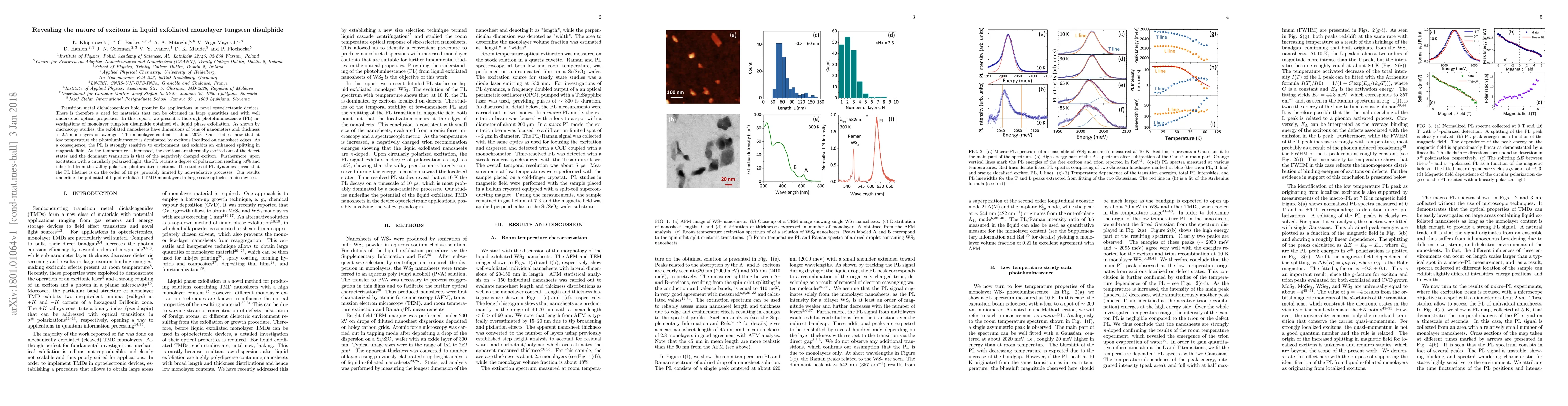 Transition metal dichalcogenides hold promise for applications in novel optoelectronic devices. There is therefore a need for materials that can be obtained in large quantities and with well understood optical properties. In this report, we present a thorough photoluminescence (PL) investigations of monolayer tungsten disulphide obtained via liquid phase exfoliation. As shown by microscopy studies, the exfoliated nanosheets have dimensions of tens of nanometers and thickness of 2.5 monolayers on average. The monolayer content is about 20%. Our studies show that at low temperature the photoluminescence is dominated by excitons localized on nanosheet edges. As a consequence, the PL is strongly sensitive to environment and exhibits an enhanced splitting in magnetic field. As the temperature is increased, the excitons are thermally excited out of the defect states and the dominant transition is that of the negatively charged exciton. Furthermore, upon excitation with a circularly polarized light, the PL retains a degree of polarization reaching 50% and inherited from the valley polarized photoexcited excitons. The studies of PL dynamics reveal that the PL lifetime is on the order of 10 ps, probably limited by non-radiative processes. Our results underline the potential of liquid exfoliated TMD monolayers in large scale optoelectronic devices.