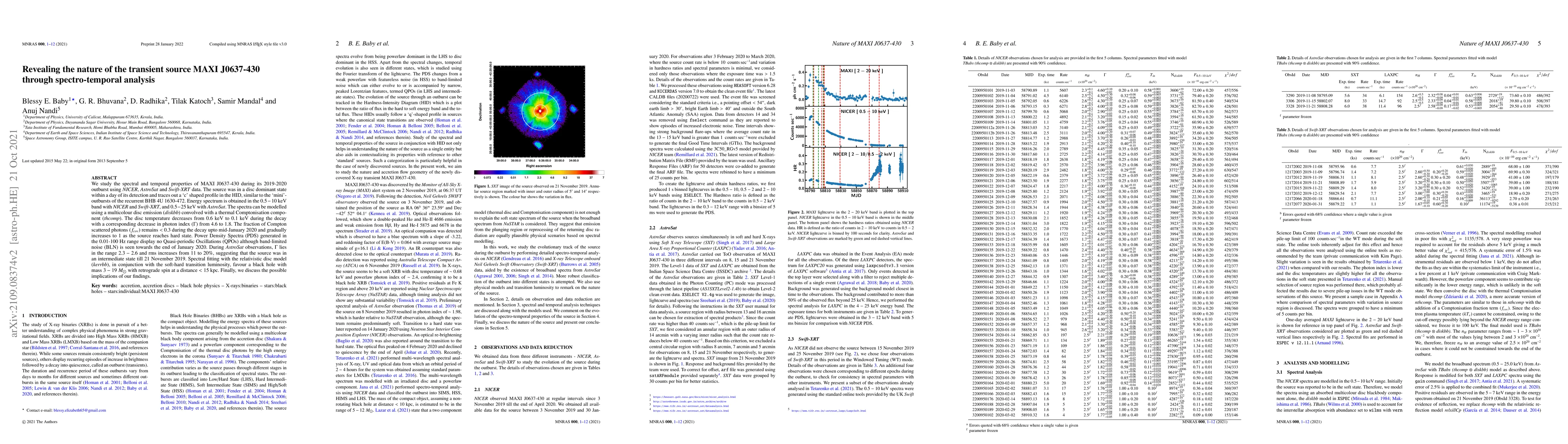We study the spectral and temporal properties of MAXI J0637-430 during its 2019-2020 outburst using \textit{NICER}, \textit{AstroSat} and \textit{Swift-XRT} data. The source was in a disc dominant state within a day of its detection and traces out a `c' shaped profile in the HID, similar to the `mini'-outbursts of the recurrent BHB 4U 1630-472. Energy spectrum is obtained in the $0.5-10$ keV band with \textit{NICER} and \textit{Swift-XRT}, and $0.5-25$ keV with \textit{AstroSat}. The spectra can be modelled using a multicolour disc emission (\textit{diskbb}) convolved with a thermal Comptonisation component (\textit{thcomp}). The disc temperature decreases from 0.6 keV to 0.1 keV during the decay with a corresponding decrease in photon index ($\Gamma$) from 4.6 to 1.8. The fraction of Compton scattered photons ($f_{cov}$) remains $<$ 0.3 during the decay upto mid-January 2020 and gradually increases to 1 as the source reaches hard state. Power Density Spectra (PDS) generated in the 0.01-100 Hz range display no Quasi-periodic Oscillations (QPOs) although band-limited noise (BLN) is seen towards the end of January 2020. During \textit{AstroSat} observations, $\Gamma$ lies in the range $2.3-2.6$ and rms increases from 11 to 20\%, suggesting that the source was in an intermediate state till 21 November 2019. Spectral fitting with the relativistic disc model (\textit{kerrbb}), in conjunction with the soft-hard transition luminosity, favour a black hole with mass $3-19$ $M_{\odot}$ with retrograde spin at a distance $<15$ kpc. Finally, we discuss the possible implications of our findings.