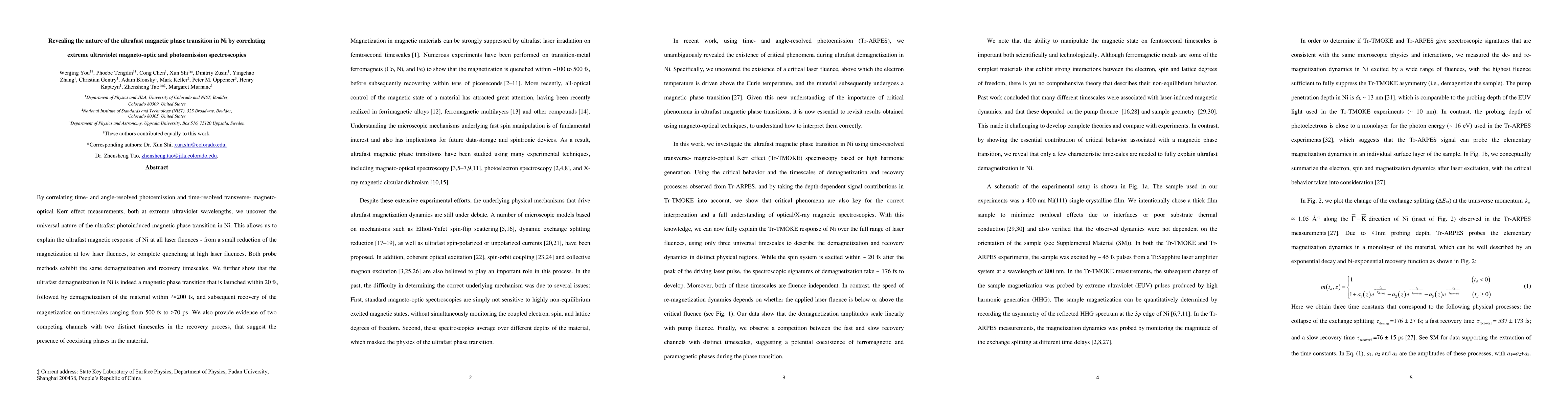 By correlating time- and angle-resolved photoemission and time-resolved transverse- magneto- optical Kerr effect measurements, both at extreme ultraviolet wavelengths, we uncover the universal nature of the ultrafast photoinduced magnetic phase transition in Ni. This allows us to explain the ultrafast magnetic response of Ni at all laser fluences - from a small reduction of the magnetization at low laser fluences, to complete quenching at high laser fluences. Both probe methods exhibit the same demagnetization and recovery timescales. We further show that the ultrafast demagnetization in Ni is indeed a magnetic phase transition that is launched within 20 fs, followed by demagnetization of the material within ~200 fs, and subsequent recovery of the magnetization on timescales ranging from 500 fs to >70 ps. We also provide evidence of two competing channels with two distinct timescales in the recovery process, that suggest the presence of coexisting phases in the material.