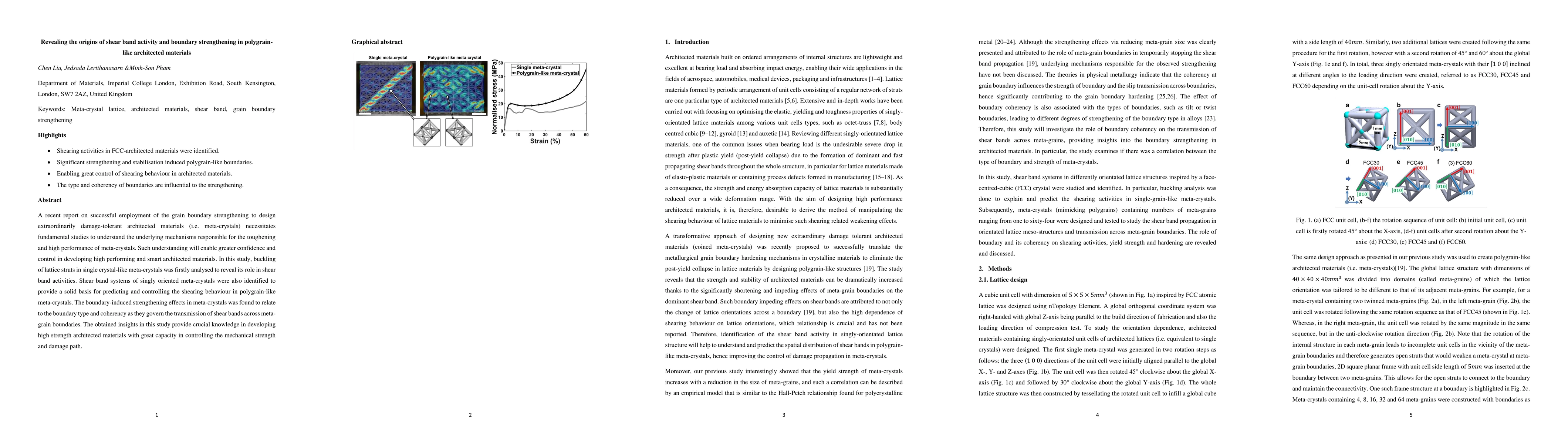 This study investigates the mechanisms behind grain boundary strengthening in meta-crystals, revealing the role of lattice strut buckling in shear band activity and identifying shear band systems in singly oriented meta-crystals. The findings link boundary-induced strengthening to the type and coherency of grain boundaries, offering insights for developing high-strength, damage-tolerant architected materials.