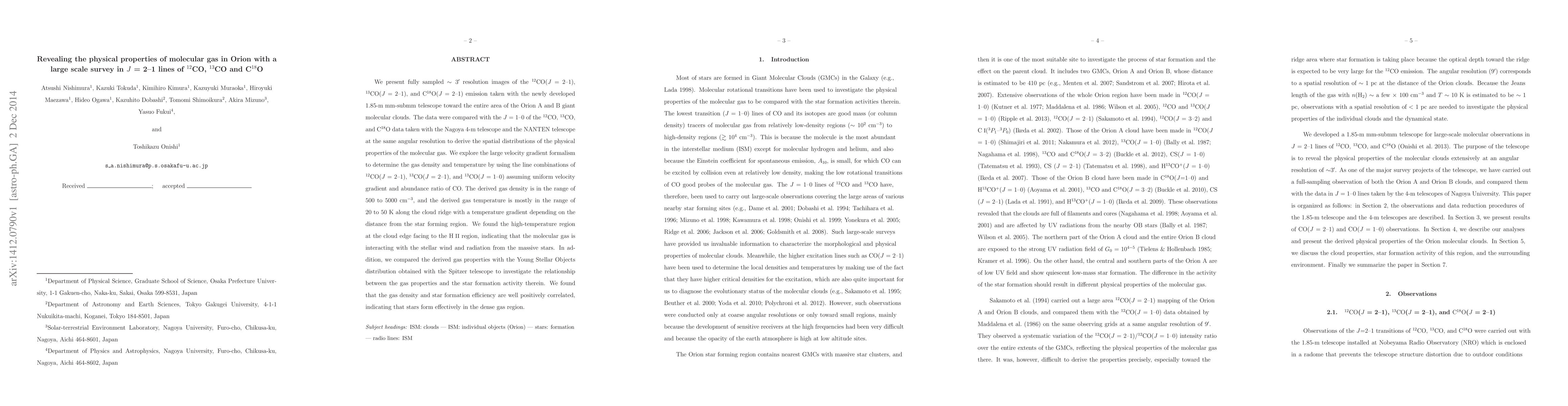 We present fully sampled ~3' resolution images of the 12CO(J=2-1), 13CO(J=2-1), and C18O(J=2-1) emission taken with the newly developed 1.85-m mm-submm telescope toward the entire area of the Orion A and B giant molecular clouds. The data were compared with the J=1-0 of the 12CO, 13CO, and C18O data taken with the Nagoya 4-m telescope and the NANTEN telescope at the same angular resolution to derive the spatial distributions of the physical properties of the molecular gas. We explore the large velocity gradient formalism to determine the gas density and temperature by using the line combinations of 12CO(J=2-1), 13CO(J=2-1), and 13CO(J=1-0) assuming uniform velocity gradient and abundance ratio of CO. The derived gas density is in the range of 500 to 5000 cm-3, and the derived gas temperature is mostly in the range of 20 to 50 K along the cloud ridge with a temperature gradient depending on the distance from the star forming region. We found the high-temperature region at the cloud edge facing to the HII region, indicating that the molecular gas is interacting with the stellar wind and radiation from the massive stars. In addition, we compared the derived gas properties with the Young Stellar Objects distribution obtained with the Spitzer telescope to investigate the relationship between the gas properties and the star formation activity therein. We found that the gas density and star formation efficiency are well positively correlated, indicating that stars form effectively in the dense gas region.