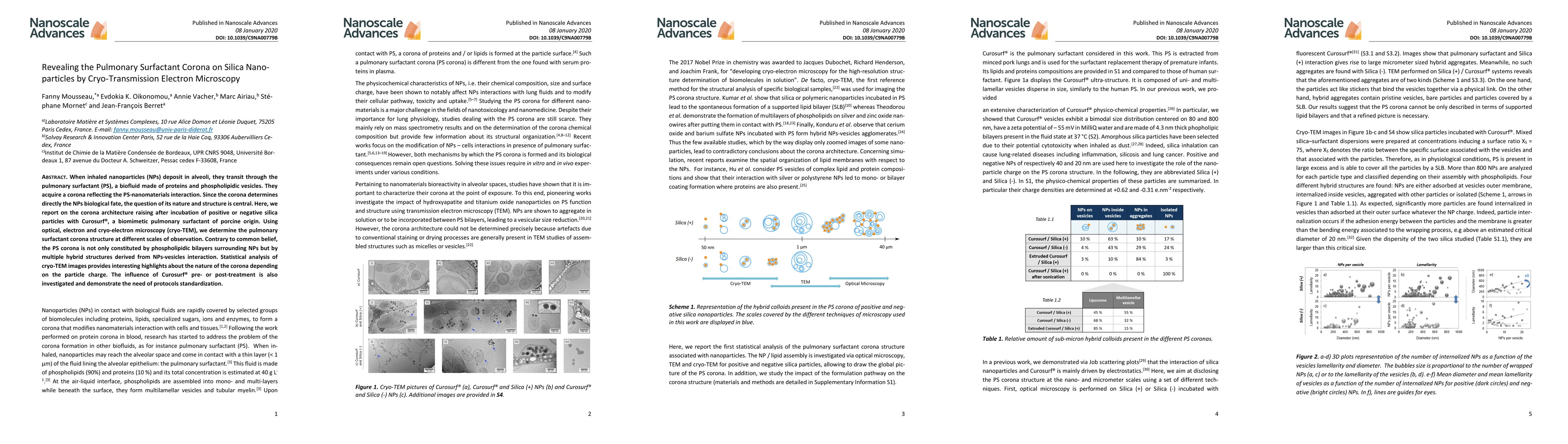 This study reveals the complex architecture of the pulmonary surfactant corona on silica nanoparticles using cryo-TEM, showing that it comprises hybrid structures from nanoparticle-vesicle interactions rather than just phospholipidic bilayers. The research highlights the importance of particle charge and surfactant treatment protocols in determining the corona's nature.