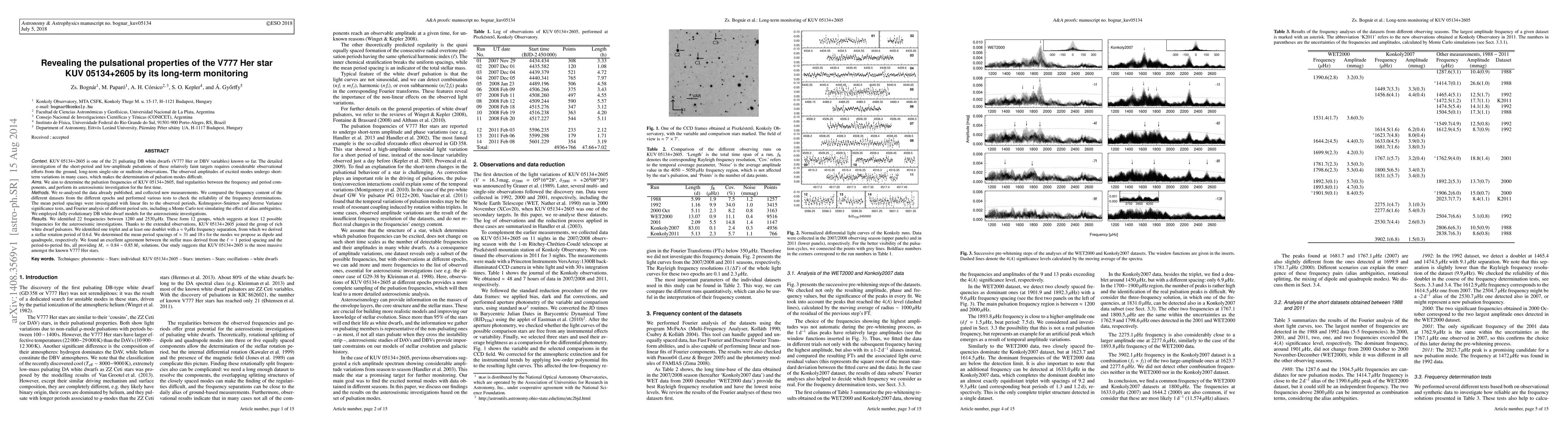 This study reveals the pulsational properties of the DBV variable star KUV 05134+2605 through long-term monitoring, identifying 22 frequencies and suggesting it is the most massive known V777 Her star with a stellar mass of 0.84-0.85 M_Sun. The analysis also determined mean period spacings and a rotation period of 0.6 days.