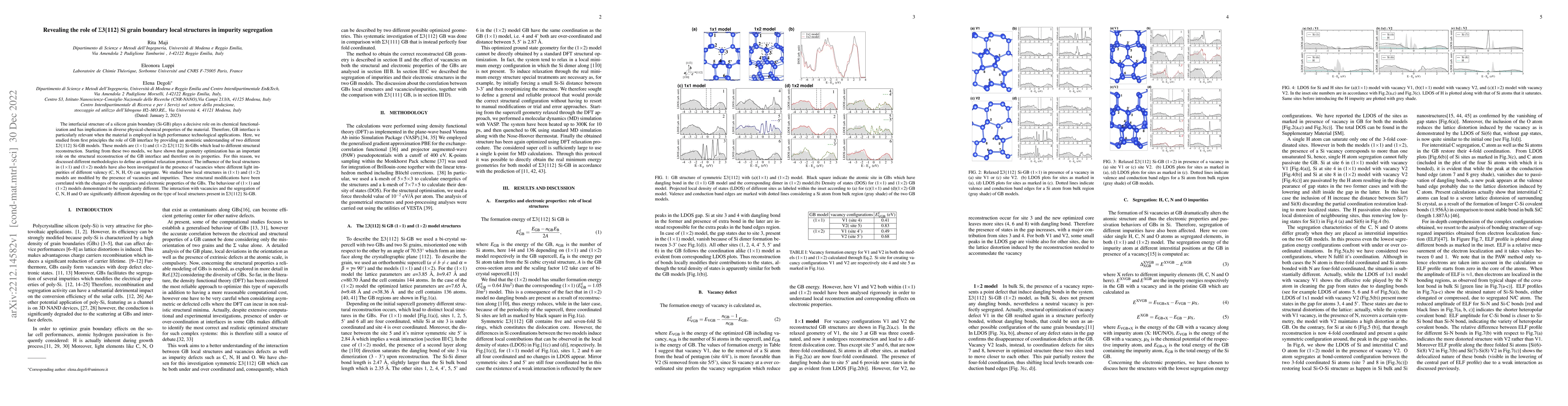 The interfacial structure of a silicon grain boundary (Si-GB) plays a decisive role on its chemical functionalization and has implications in diverse physical-chemical properties of the material. Therefore, GB interface is particularly relevant when the material is employed in high performance technological applications. Here, we studied from first principles the role of GB interface by providing an atomistic understanding of two different $\Sigma$3\{112\} Si-GB models. These models are (1$\times$1) and (1$\times$2) $\Sigma$3\{112\} Si-GBs which lead to different structural reconstruction. Starting from these two models, we have shown that geometry optimization has an important role on the structural reconstruction of the GB interface and therefore on its properties. For this reason, we discussed different methodologies to define an optimal relaxation protocol. The influence of the local structures in (1$\times$1) and (1$\times$2) models have also been investigated in the presence of vacancies where different light impurities of different valency (C, N, H, O) can segregate. We studied how local structures in (1$\times$1) and (1$\times$2) models are modified by the presence of vacancies and impurities. These structural modifications have been correlated with the changes of the energetics and electronic properties of the GBs. The behavior of (1$\times$1) and (1$\times$2) models demonstrated to be significantly different. The interaction with vacancies and the segregation of C, N, H and O are significantly different depending on the type of local structures present in $\Sigma$3\{112\} Si-GB.