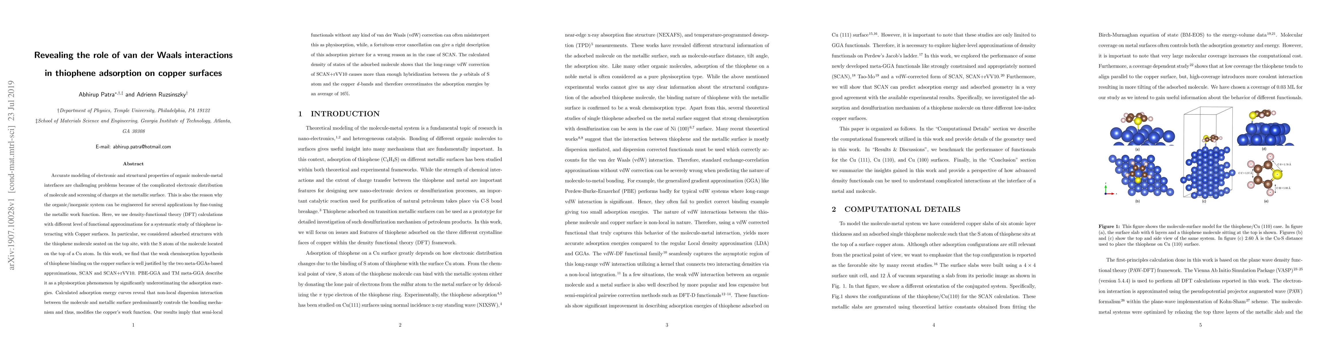 Accurate modeling of electronic and structural properties of organic molecule-metal interfaces are challenging problems because of the complicated electronic distribution of molecule and screening of charges at the metallic surface. This is also the reason why the organic/inorganic system can be engineered for several applications by fine-tuning the metallic work function. Here, we use density-functional theory (DFT) calculations with different level of functional approximations for a systematic study of thiophene interacting with Copper surfaces. In particular, we considered adsorbed structures with the thiophene molecule seated on the top site, with the S atom of the molecule located on the top of a Cu atom. In this work, we find that the weak chemisorption hypothesis of thiophene binding on the copper surface is well justified by the two meta-GGAs-based approximations, SCAN and SCAN+rVV10. PBE-GGA and TM meta-GGA describe it as a physisorption phenomenon by significantly underestimating the adsorption energies. Calculated adsorption energy curves reveal that non-local dispersion interaction between the molecule and metallic surface predominantly controls the bonding mechanism and thus, modifies the copper's work function. Our results imply that semi-local functionals without any kind of van der Waals (vdW) correction can often misinterpret this as physisorption, while, a fortuitous error cancellation can give a right description of this adsorption picture for a wrong reason as in the case of SCAN. The calculated density of states of the adsorbed molecule shows that the long-range vdW correction of SCAN+rVV10 causes more than enough hybridization between the \textit{p} orbitals of S atom and the copper \textit{d}-bands and therefore overestimates the adsorption energies by an average of 16\%.