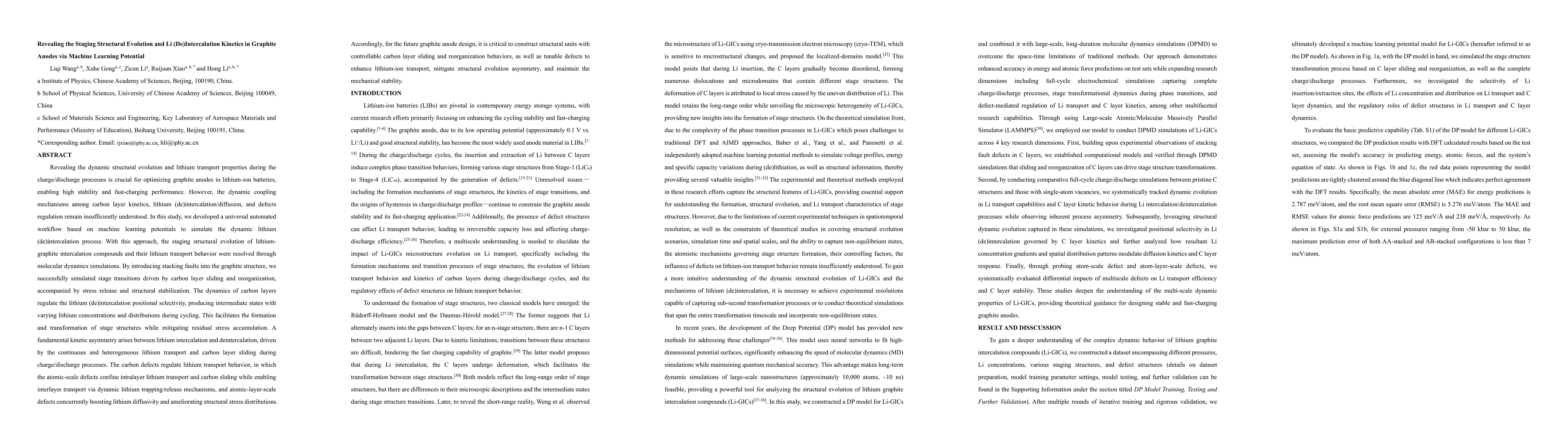 The development of a machine learning potential model for Li-GICs and its application in DPMD simulations to reveal the staging structural evolution and lithium (de)intercalation kinetics in graphite anodes.