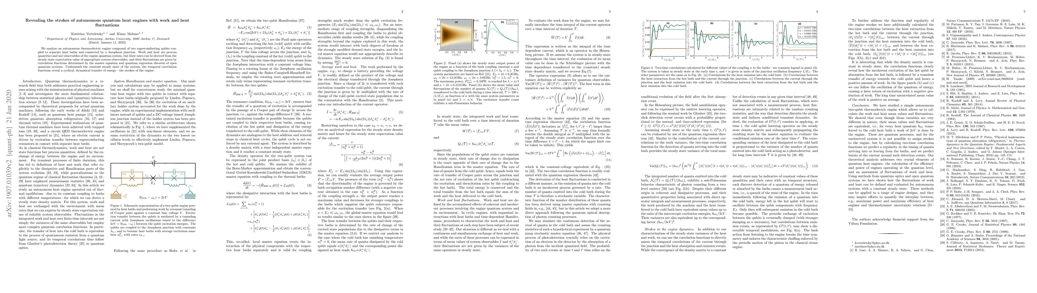 We analyze an autonomous thermoelectric engine composed of two superconducting qubits coupled to separate heat baths and connected by a Josephson junction. Work and heat are process quantities and not observables of the engine quantum system, but their rates can be derived from the steady state expectation value of appropriate system observables and their fluctuations are given by correlation functions determined with the GKLS master equation and quantum regression theorem. The correlation functions also reveal a cyclical, dynamical transfer of energy - the strokes of the engine - hiding underneath the steady state.
