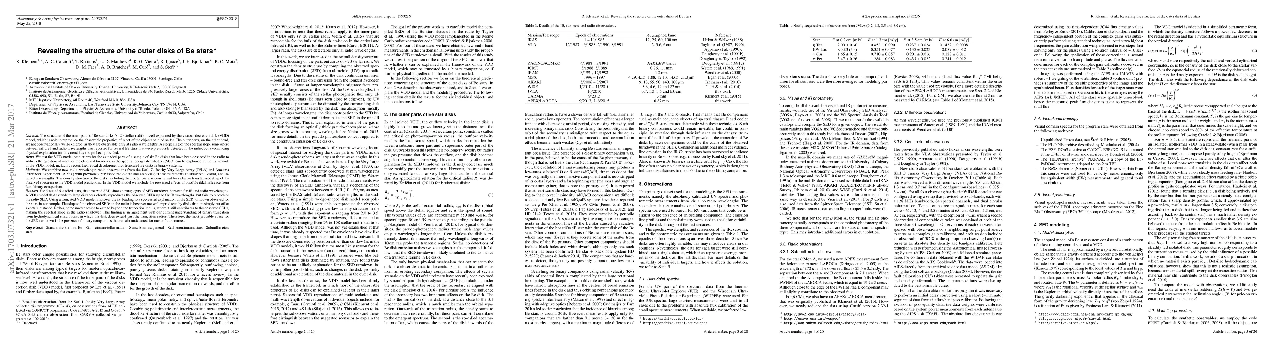 This research investigates the structure of the outer disks of Be stars using new radio observations and radiative transfer modeling. It finds that while the viscous decretion disk model explains the spectral energy distribution up to far-IR wavelengths, it fails to account for the observed radio emissions, suggesting complexities beyond the model's current scope.